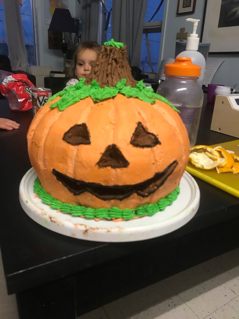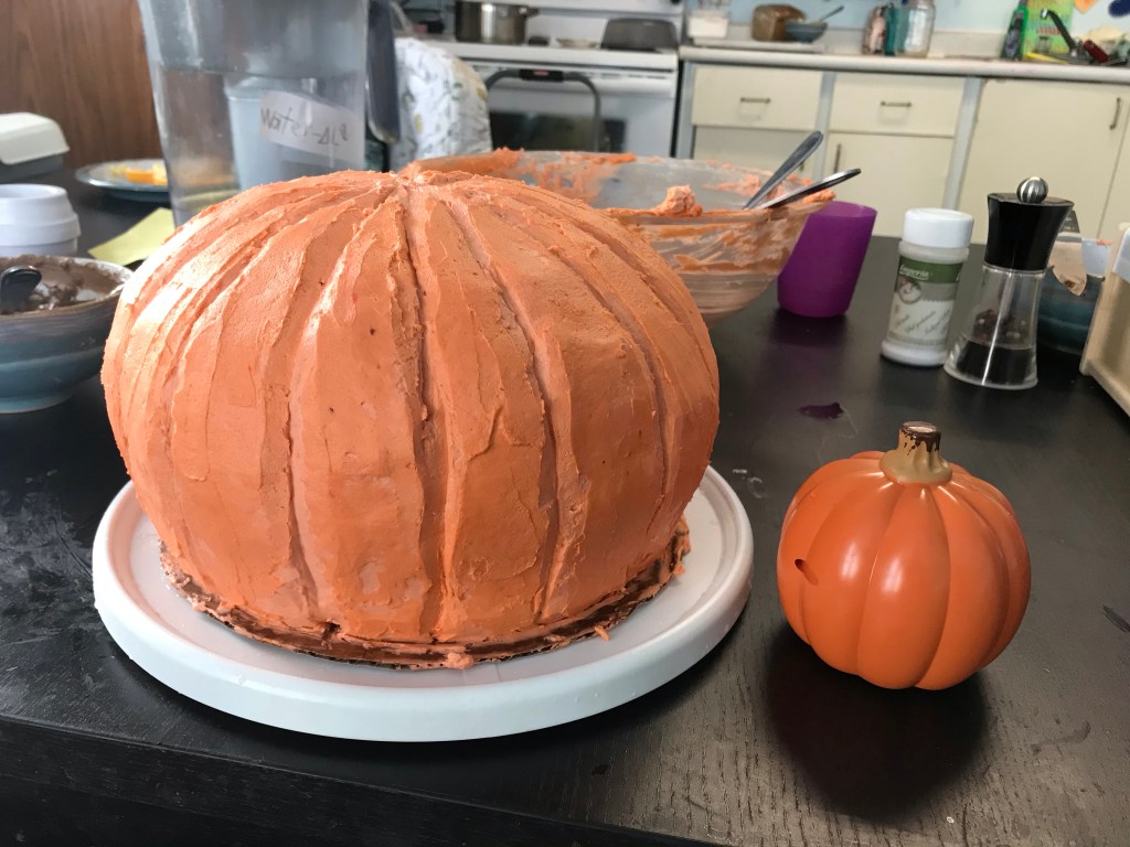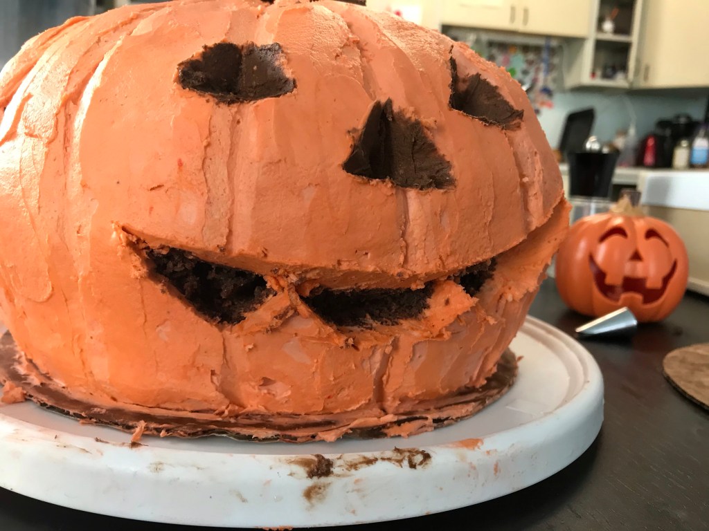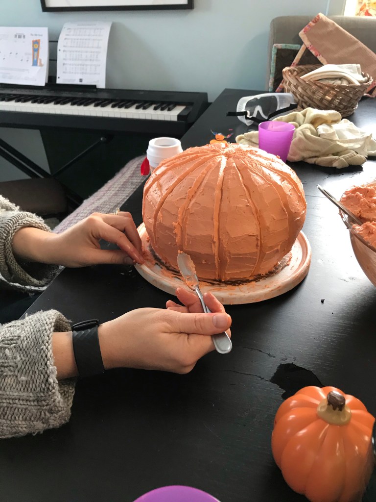 Everyone is very intense about being included in the baking process. Until there’s something to lick, then Mama can finish. Two big 9” cakes, and a massive batch of buttercreamTwo layers became four,And one color became three.I rounded the edges a bit and did a crumb coat.Then I used a final coat to make the shape more round…And used a butter knife to carve ridges and smooth them out. Pretty pumpkin-like, right?I glued the cake shavings together with chocolate buttercream and carved them into a little volcano-shaped stem.For the face, I carved out indentations, then filled them with a little chocolate frosting, and edged them with a little black gel frosting in a tube that I had lying around.Some green piped details, and we’re done! I love him.