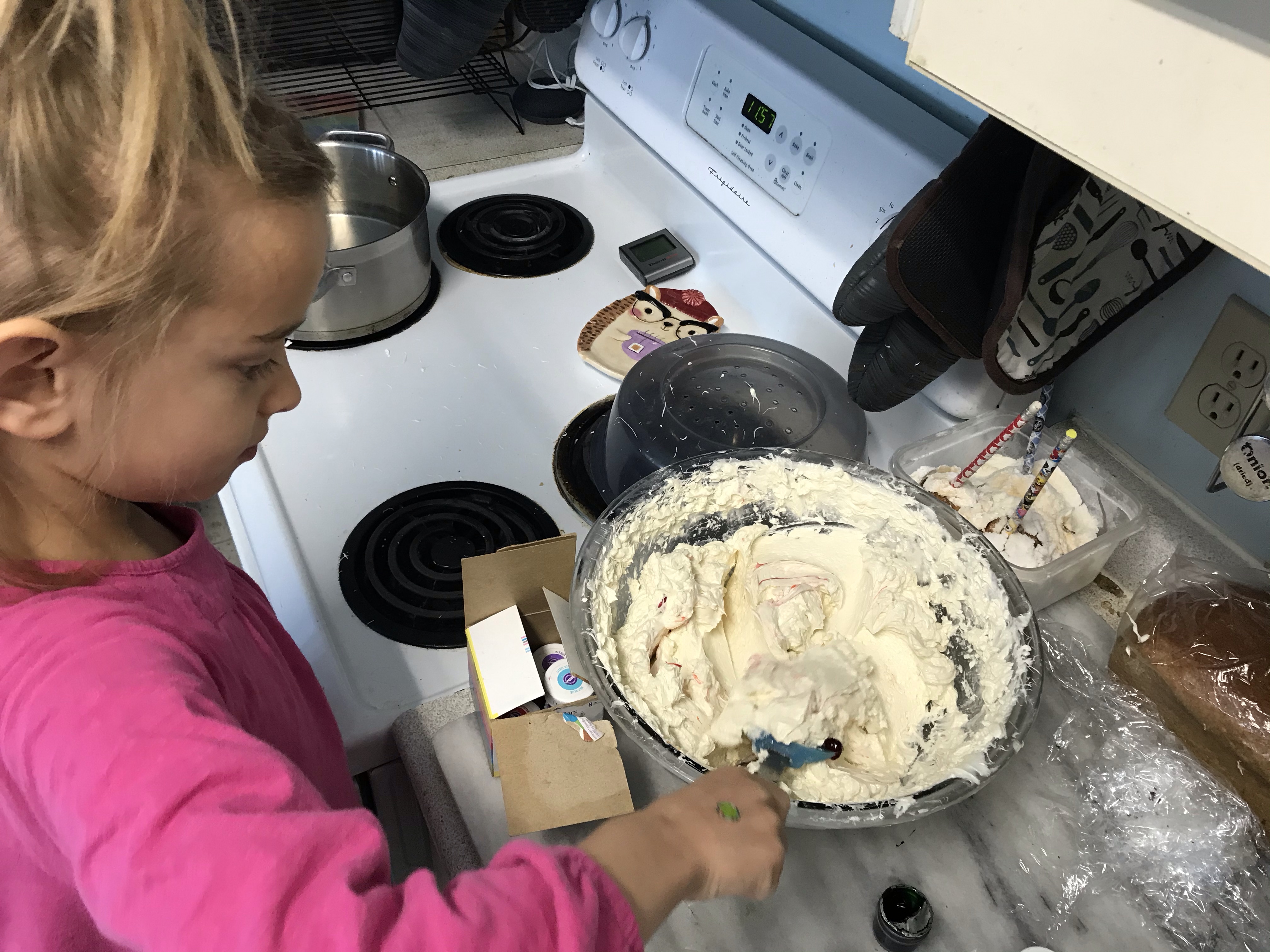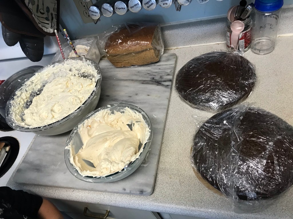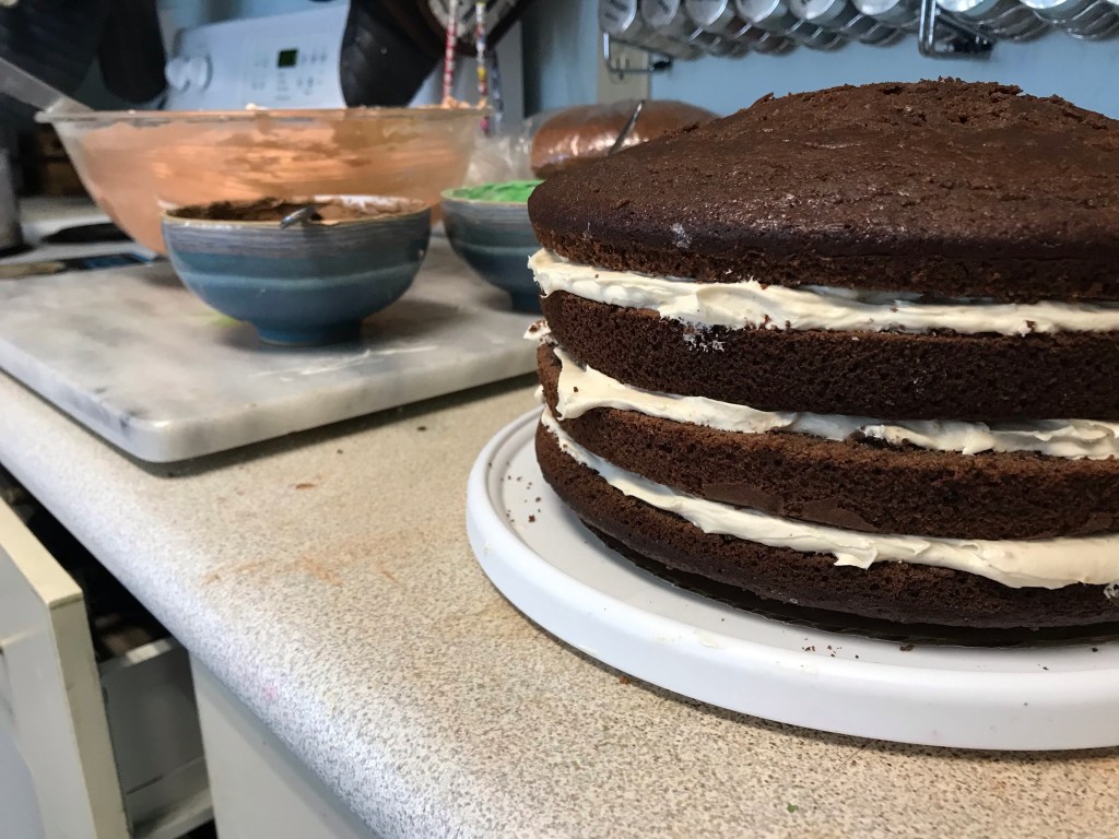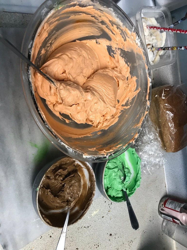 Everyone is very intense about being included in the baking process. Until there’s something to lick, then Mama can finish. Two big 9” cakes, and a massive batch of buttercreamTwo layers became four,And one color became three.I rounded the edges a bit and did a crumb coat.Then I used a final coat to make the shape more round…And used a butter knife to carve ridges and smooth them out. Pretty pumpkin-like, right?I glued the cake shavings together with chocolate buttercream and carved them into a little volcano-shaped stem.For the face, I carved out indentations, then filled them with a little chocolate frosting, and edged them with a little black gel frosting in a tube that I had lying around.Some green piped details, and we’re done! I love him.