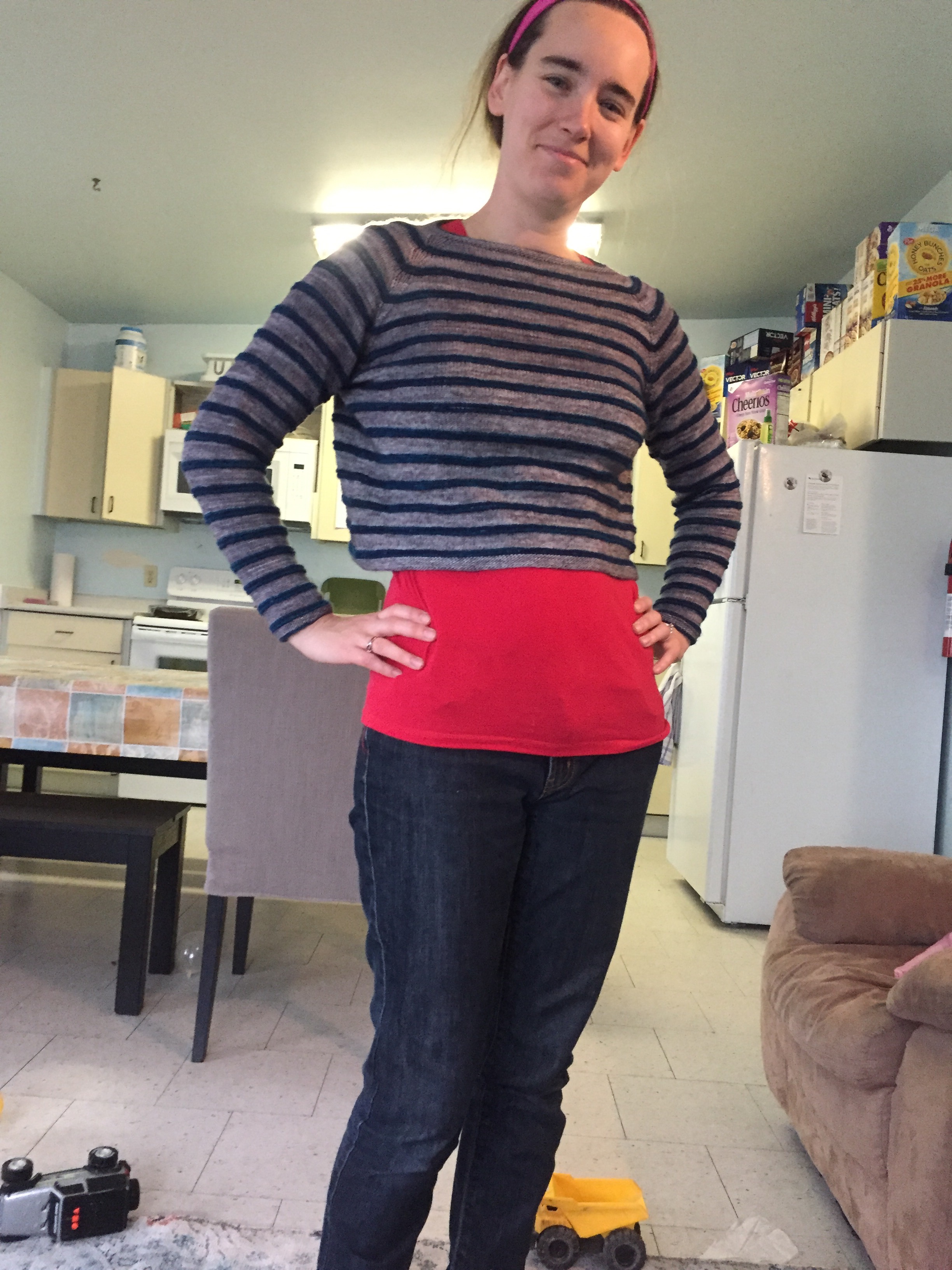 One sweater finished, one sweater finished, and another sweater, finished and restarted: Strodie. You might remember the sweater I finished a little over a year ago, a cropped sweater with welted stripes: