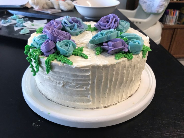This was our family half-birthday cake, divided into quarters for the four half-birthdays we have in October. I’ve learned to make swiss buttercream frosting, and the thing about buttercream is, it’s definitely in service of the maker of the cake, and not the eater of the cake. Lovely to work with, makes beautiful cakes, but kinda gross to eat, especially in large quantities.