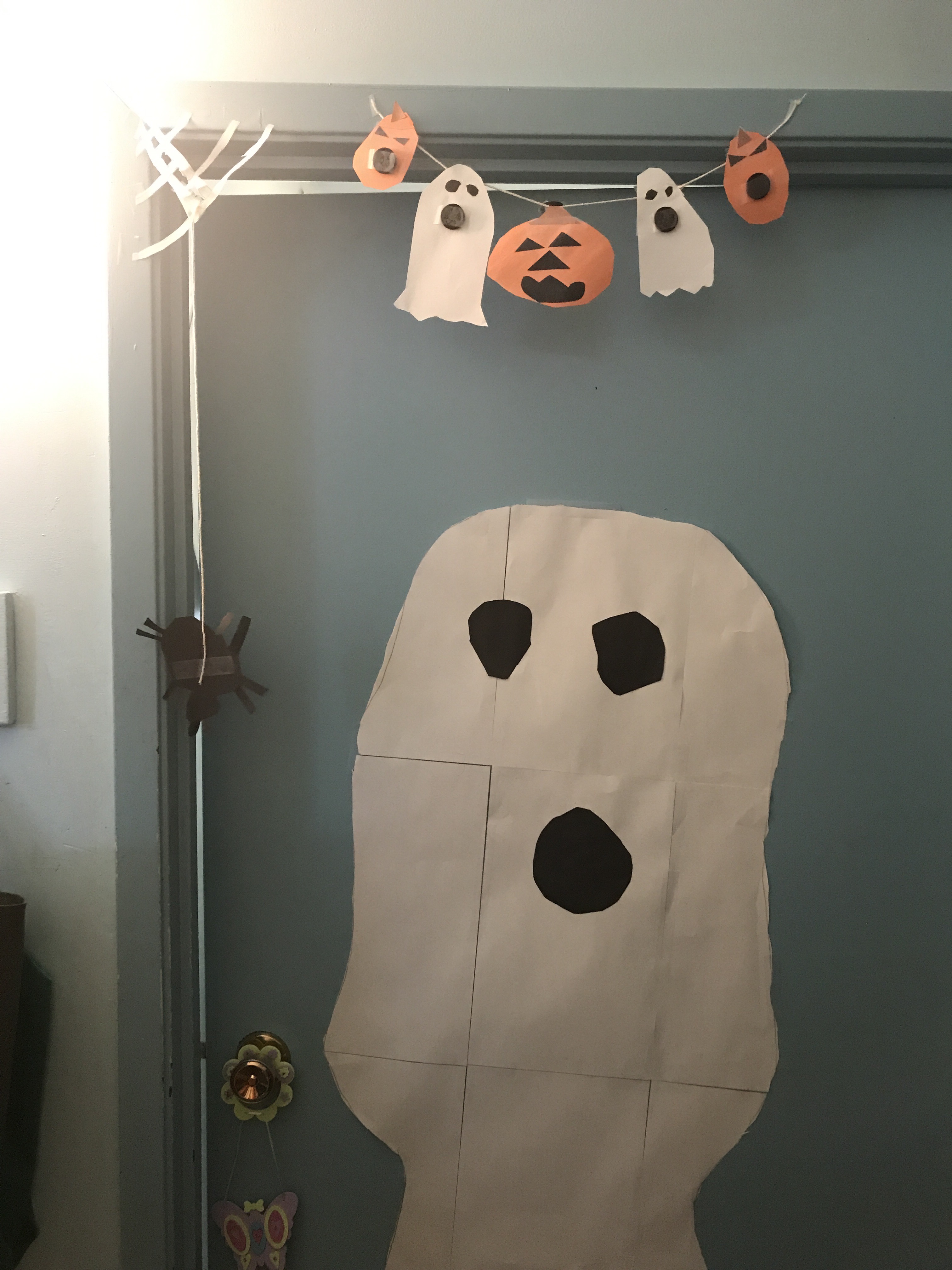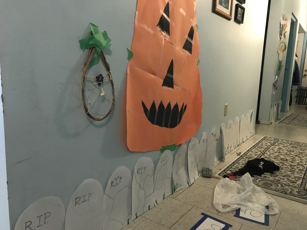 There are bats and spiders hanging from the ceiling, some ingenious cracks across the windows, and my personal favorite: a sign saying “Boo!” that is dripping blood into a puddle on the floor.