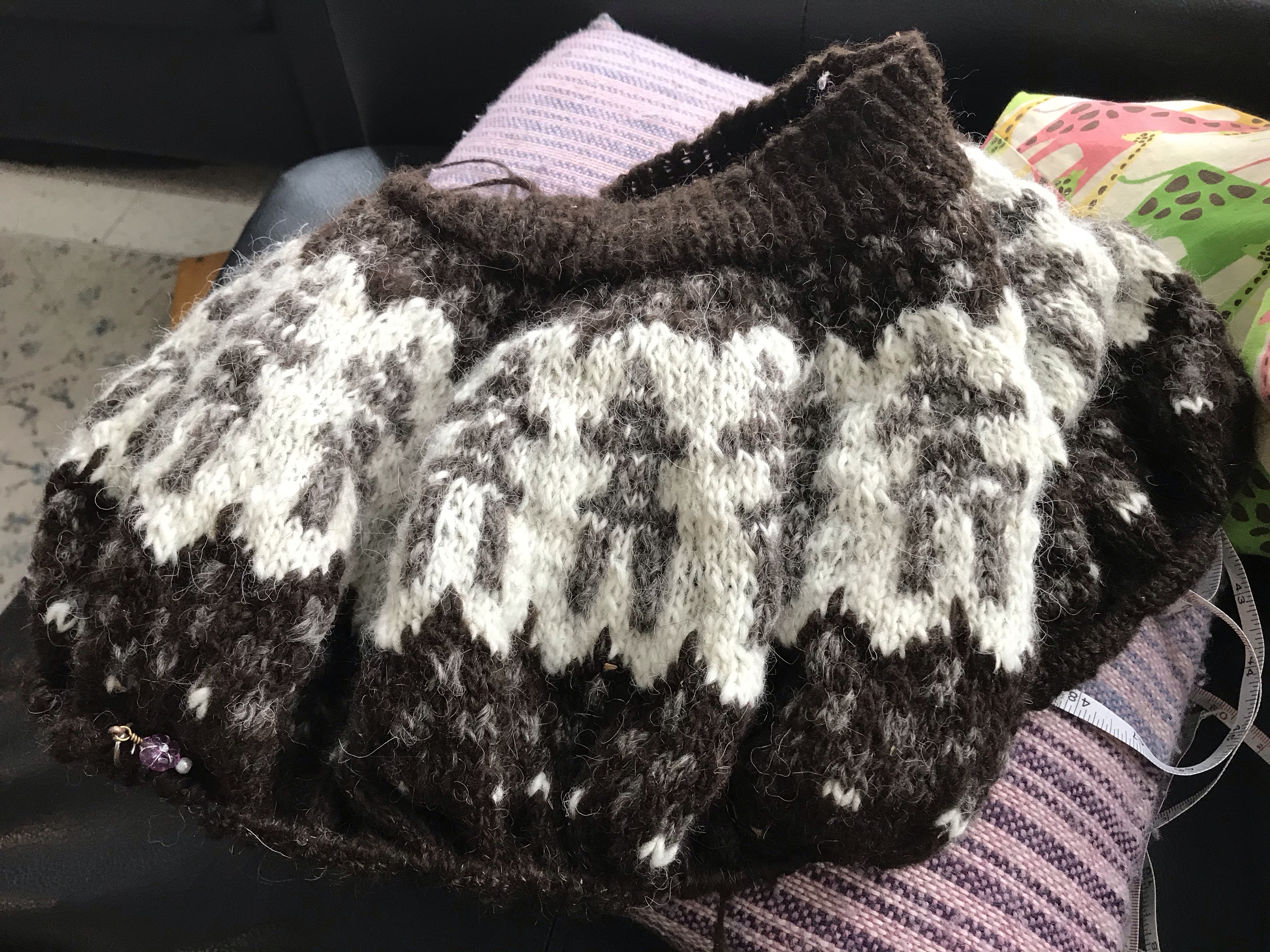 That’s a sweater finished; here’s a sweater started. I forget when exactly I cast on my Inukshuk sweater, but I got through the yoke this month.