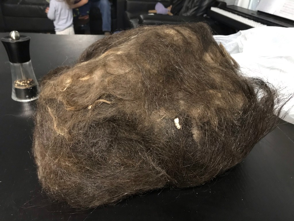 Being of a thrifty disposition, I saved the guard hairs, as you see above. I just stuffed them in a bag, threw them under the bed, and forgot about them. But how pleased I was to find them last week!