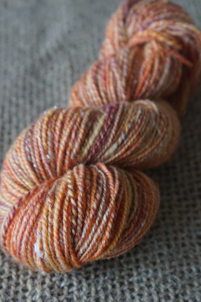 I spun this into a 2-ply, just spinning it how it wanted to be spun. I enjoyed the pops of texture and variations of color so much. It came out around a heavy fingering/sport weight.