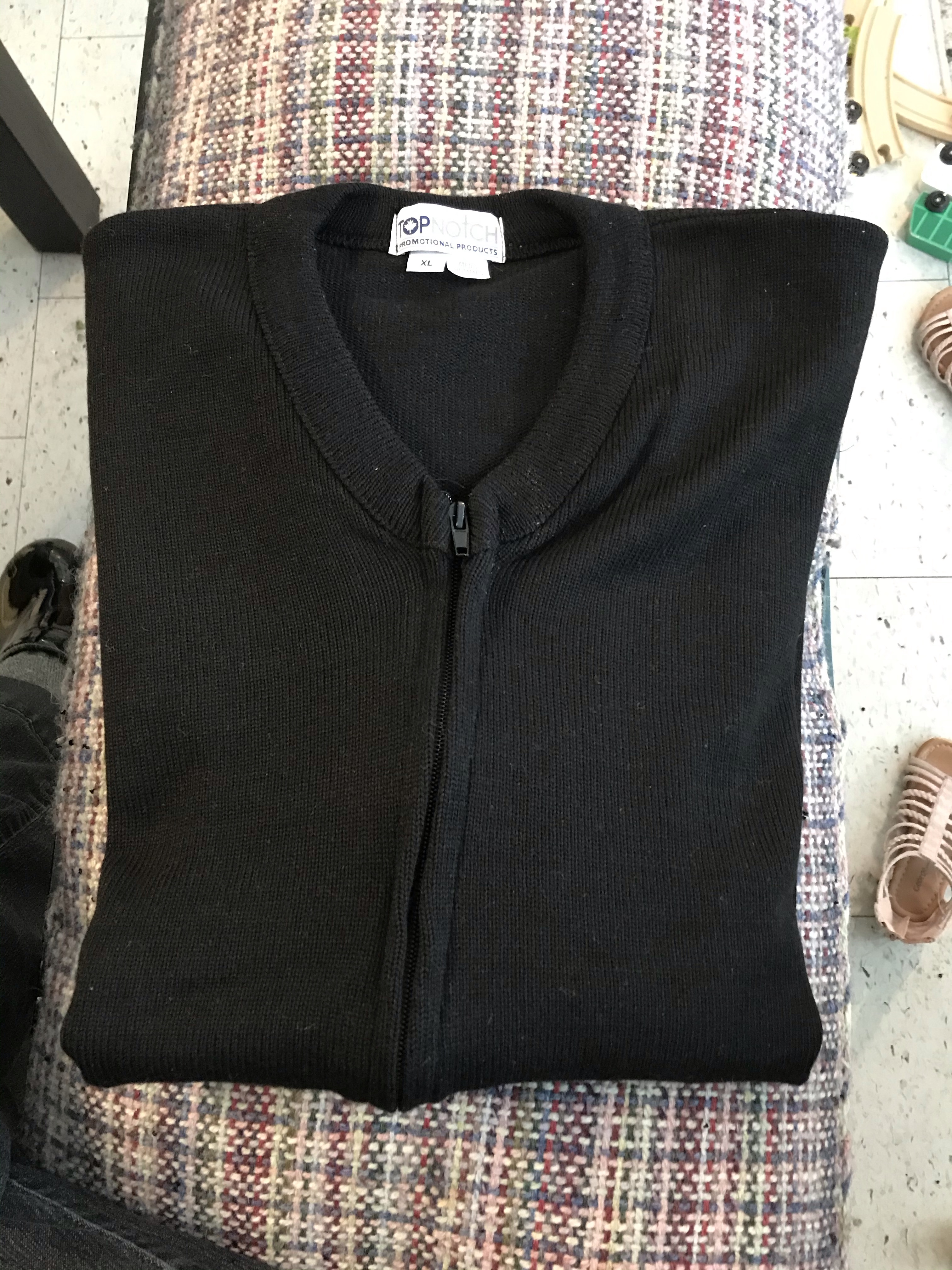 More thrift store fun today. Last year, they were donated a whole box of these giant black sweaters. The sweaters were brand new, clearly meant to be embroidered with promotional information or something, but not of a style that anyone in town would have much use for.