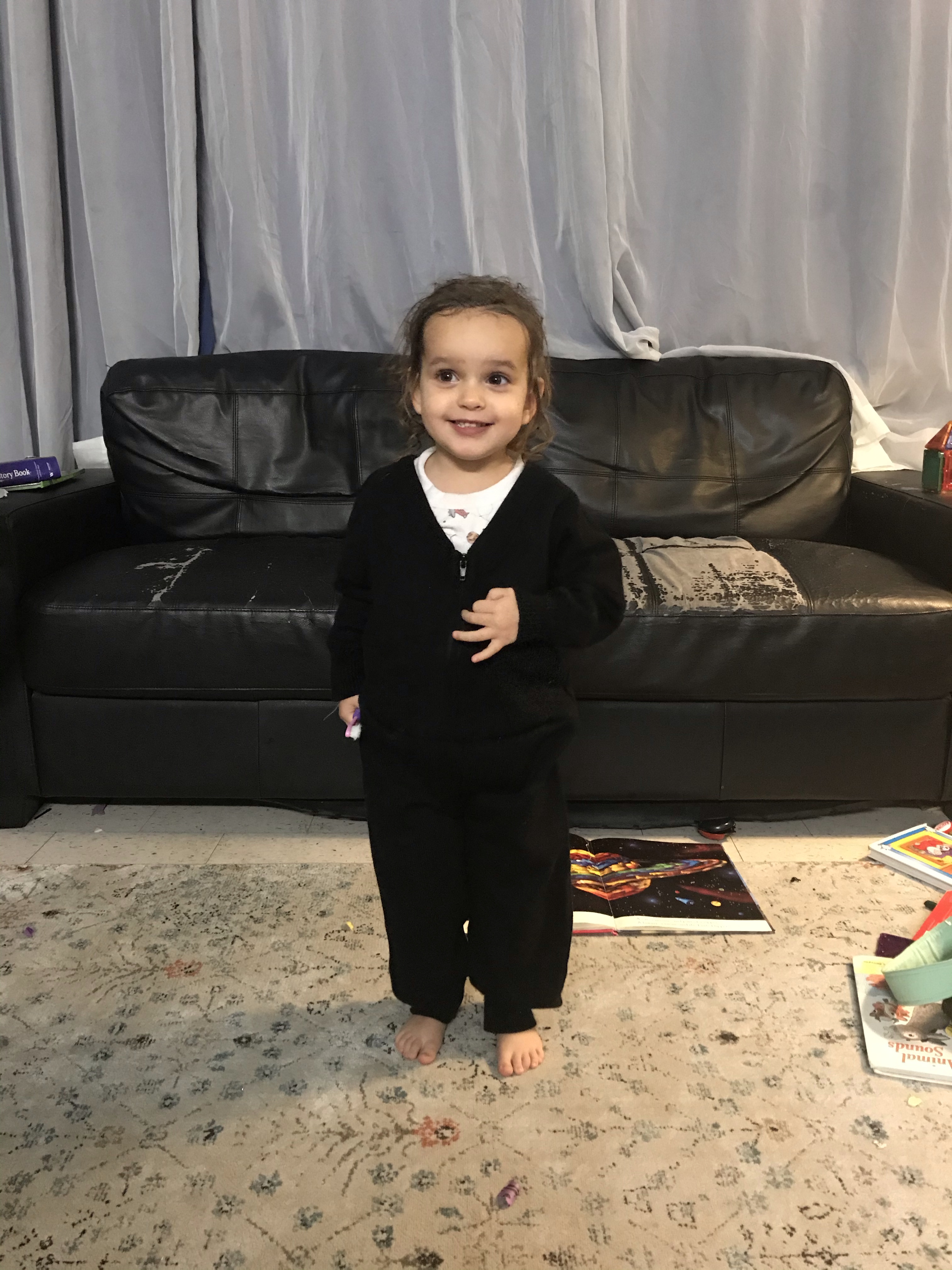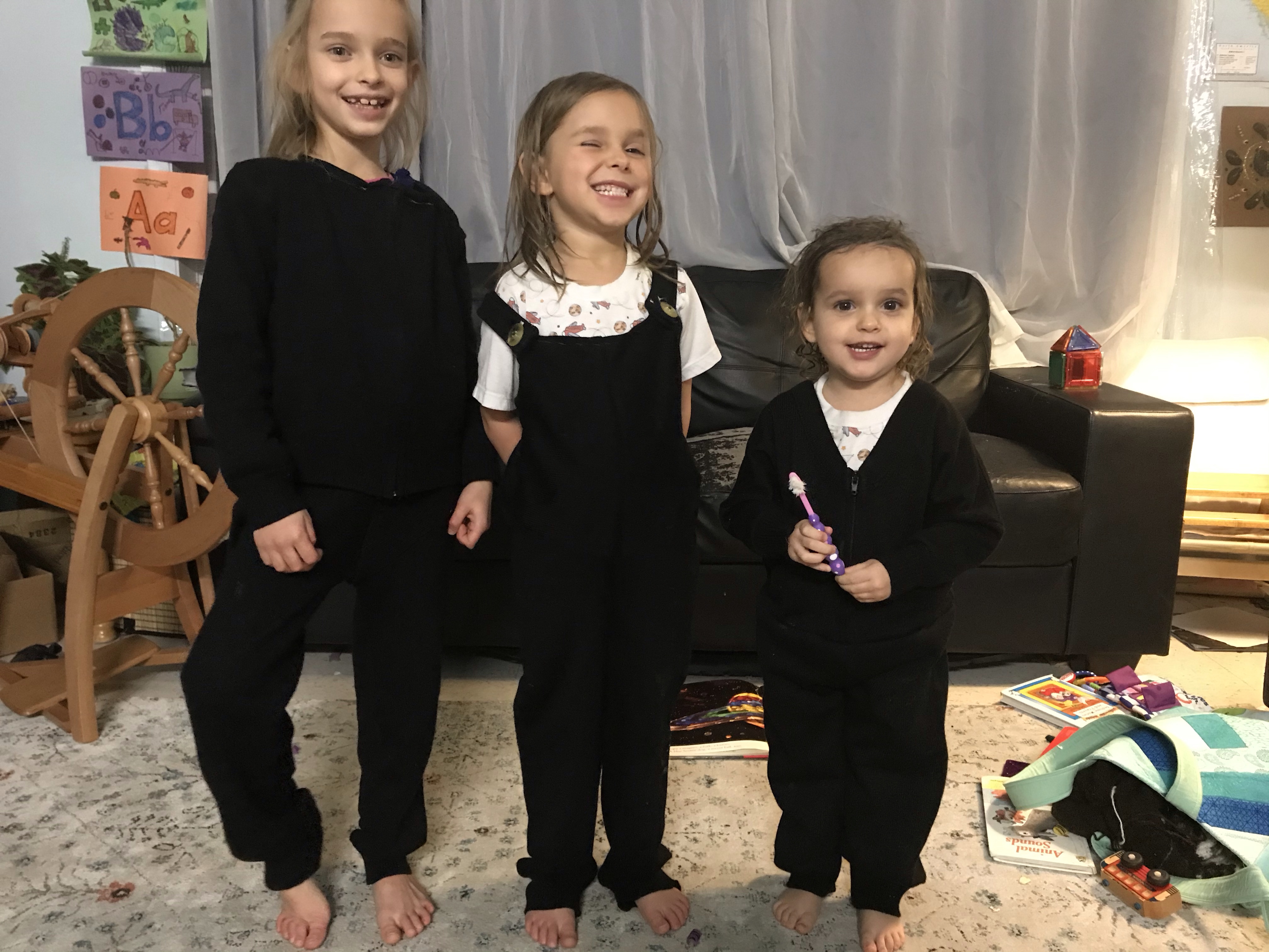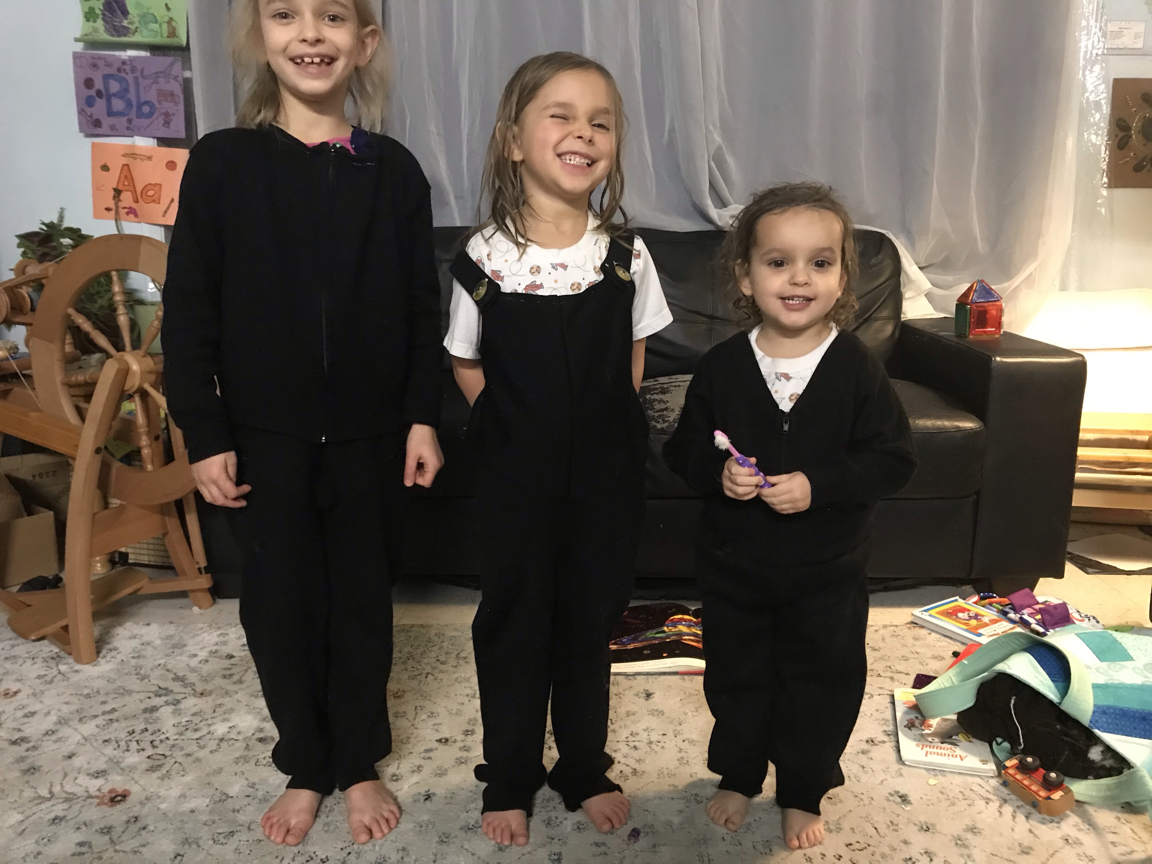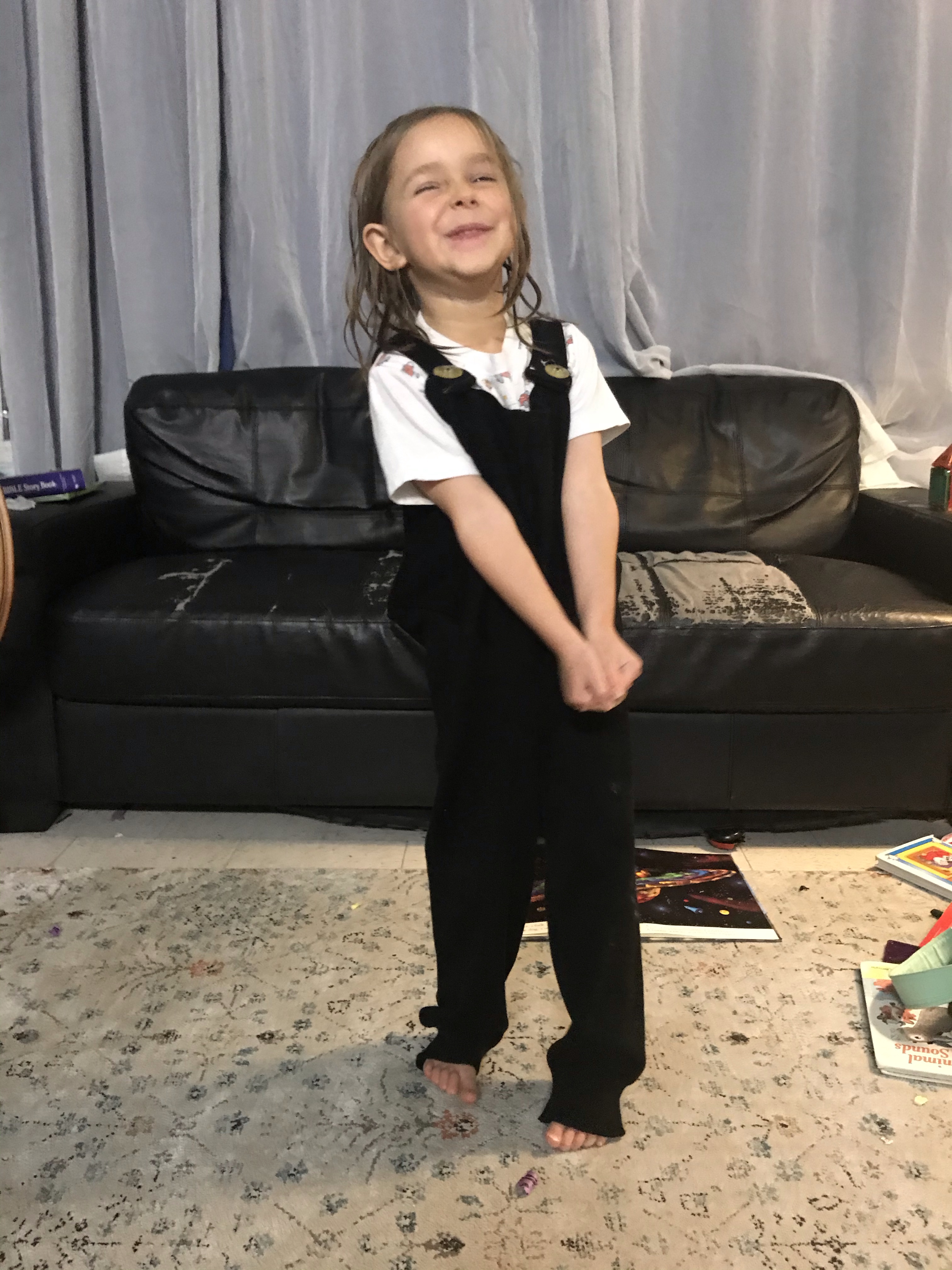 She kept pulling them up, so I added some suspenders, made from tubes of the excess fabric. And, after owning my sewing machine for over a decade, I finally made buttonholes with it.