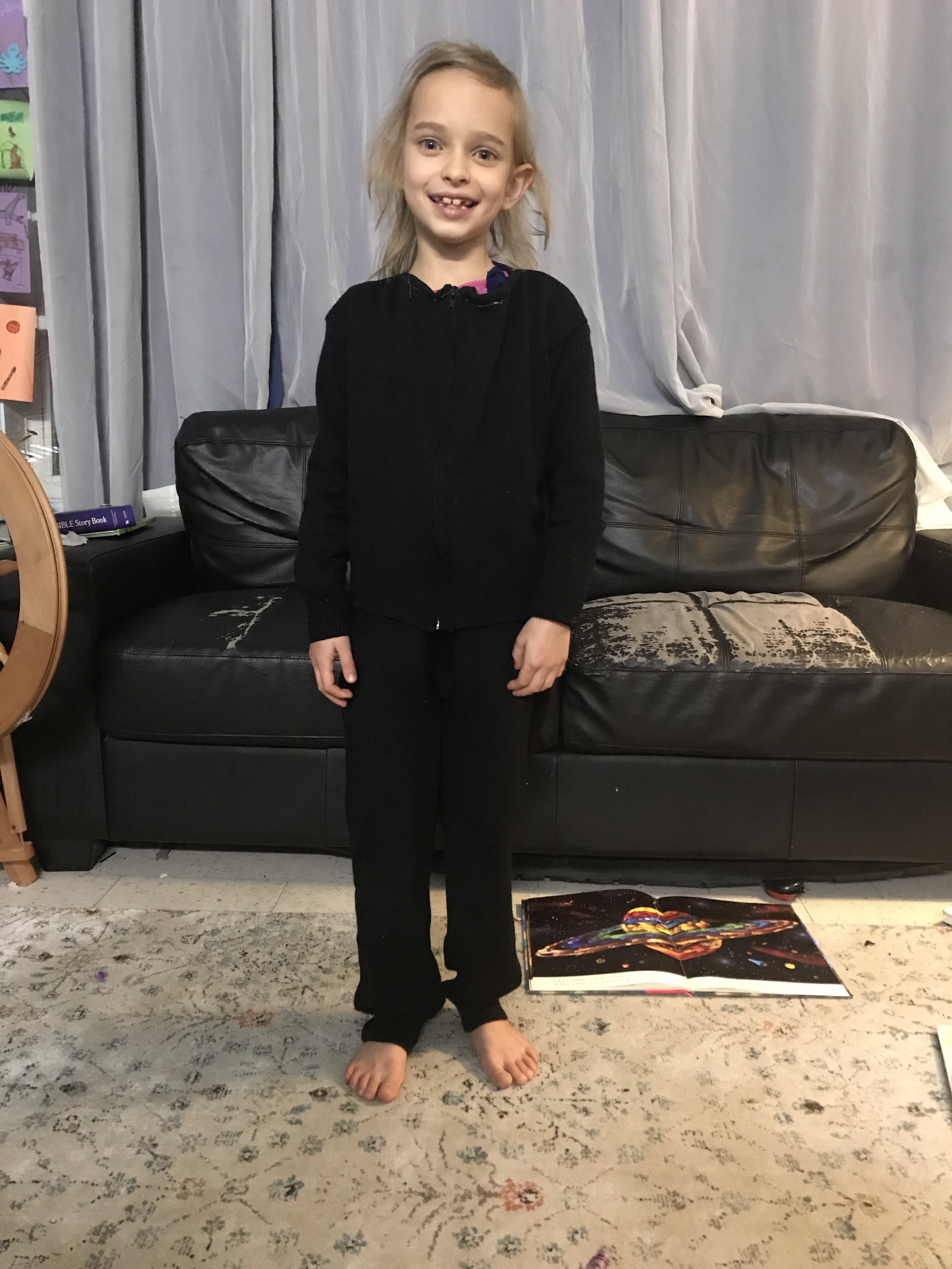 My inspiration was Stephen West’s swants. Each garment started with me sticking my kids legs into a sweater’s arms, and seeing how far up they went. For Stringbean, I cut the sweater across just under the arms, cutting the back in half. When I pieced it together, the collar ended up fitting pretty well around her waist, so I just tapered off the rest of the fabric.