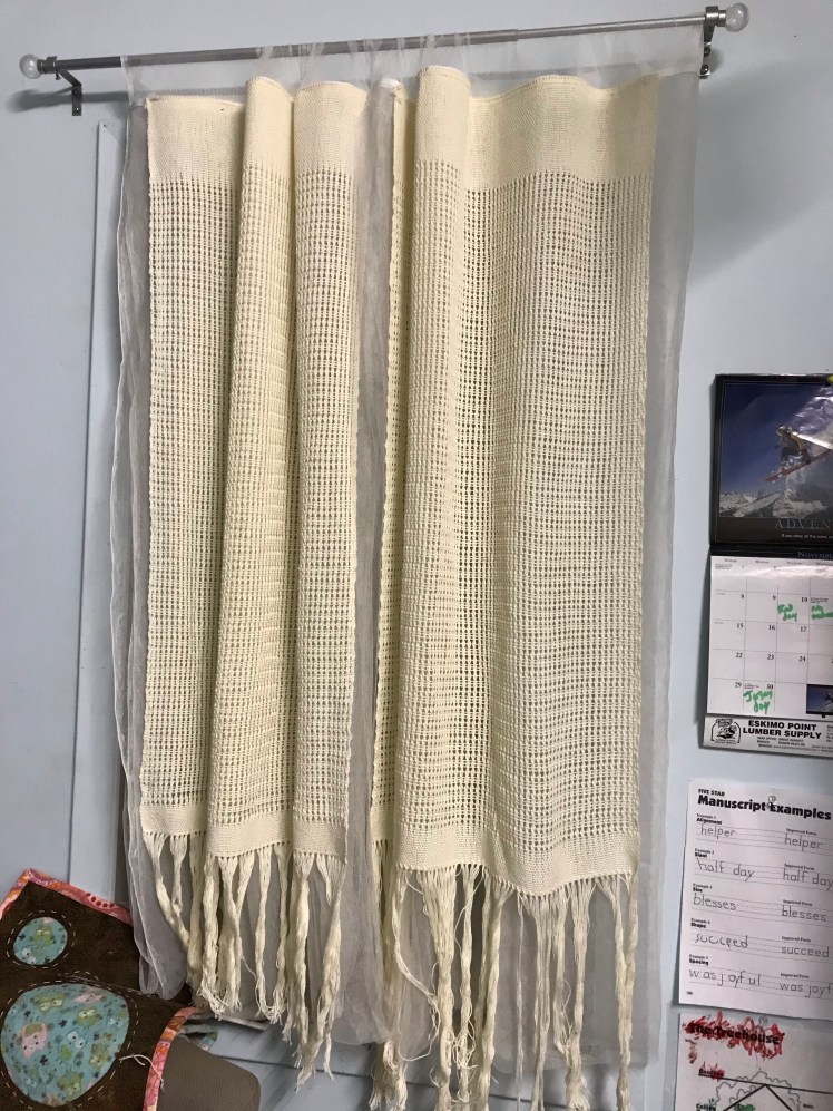 Sadly, I completely miscalculated the length I should have woven. This is why you weave a sample and wash it, folks! Eventually, I want to move the curtain rod down a few inches and deal with that straggly fringe. But the curtains hang their now, pretty much as you see here, and I haven’t gotten around to changing them. I just look at that beautiful lace and sigh with happiness, and don’t even notice the straggleyness.