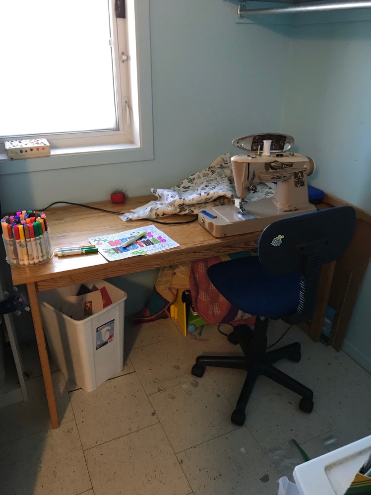 A cool thing that happened just in December was that I carved a sewing space out of the playroom. The closet area was functionally just a dumping area for the kids, so I cleared it off and set up shop. I had originally thought this would be a temporary operation, since I needed the dedicated table space to quilt, but I’m loathe to take it down. It’s just as refreshing as the weaving corner in Jared’s office. Both these little spaces feel like integration.