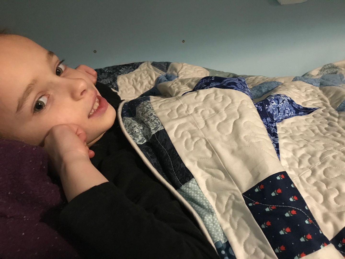 Stringbean is very pleased with her new quilt. She slept under it for the first time last night, and I have wild hopes that having a nice quilt will make her more excited to make her bed!