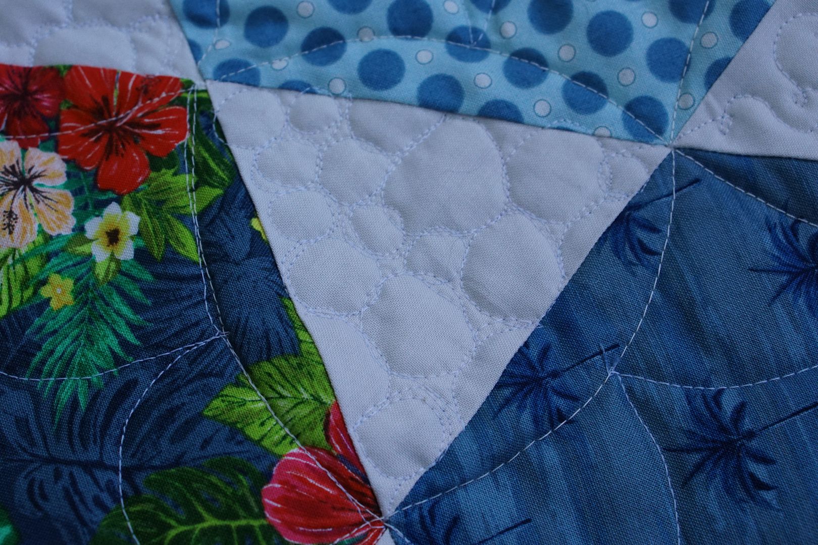 Some, like the one above, have shallower curves. Others, like the one below, have deeper curves. I just made one curve, then tried to be kind of consistent around the hexagon. None of them are perfect, and some of them are very wonky. You can see one of my traveling errors below. But I think the overall look of the quilting is whimsical, and on a kid’s quilt, that offers a nice contrast to all the clean, straight lines.