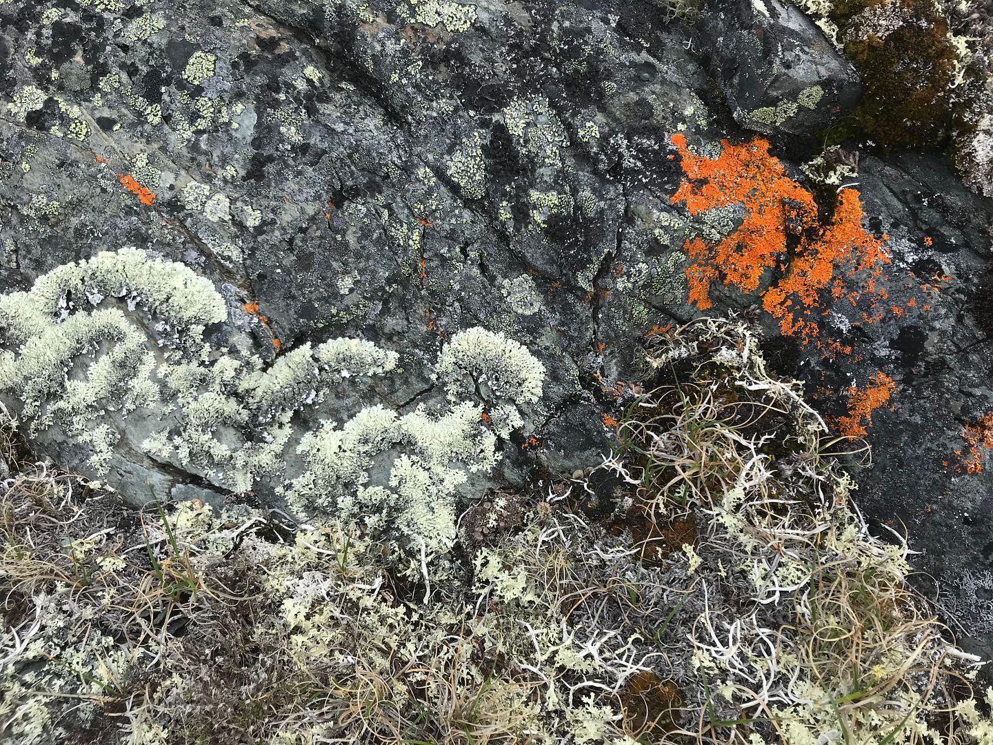 Bright orange isn’t a color I think about finding in nature every day. But it’s there, and one brilliant example is the Jeweled Lichen, also called “Elegant Sunburst.” It grows on every rock near our friends’ cabin. It seems to hide in cracks and spread across surfaces as soon as the sun and rain find it peeping out from under the snow. My nature guide says that it cannot be removed from the surface it clings to without coming apart. I remember hearing once that it feeds on the nutrients in bird droppings.