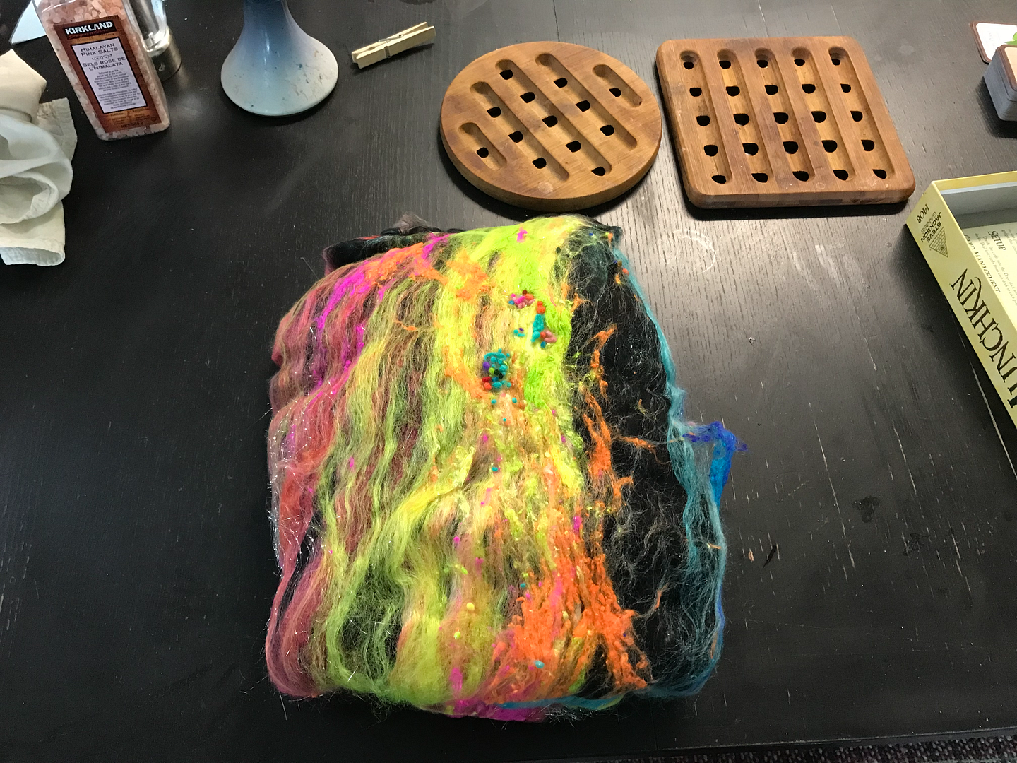 This show-stopping batt was made for me about three years ago by Nicole of Frost Yarn. Nicole will tear out her hair if every she sees this, but my plan has always been to spin this batt into traditional-but-textured singles, and ply them with two plain black singles. The result should be a mostly-black yarn with some neon pops, incorporating that crazy rainbow into my wardrobe in a way that I could actually wear on a Sunday morning.