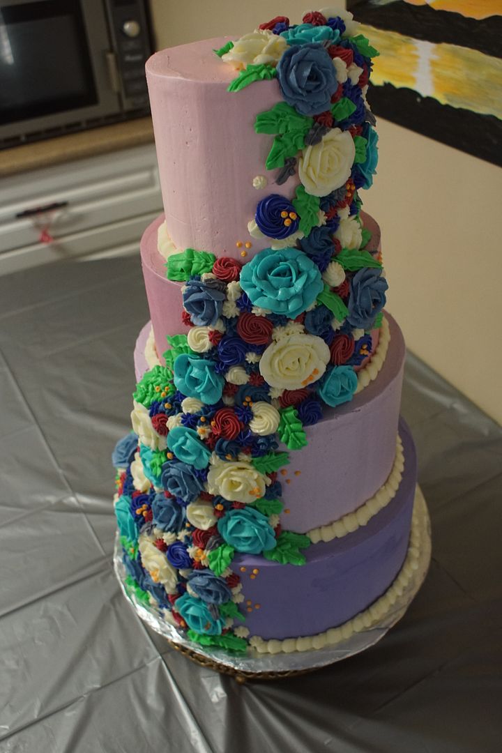 Saturday was the Big Day. I whipped up all my colors and put them in bags. I stacked the cakes, the top two and bottom two tiers together, and then started building out the flower cascade on each.