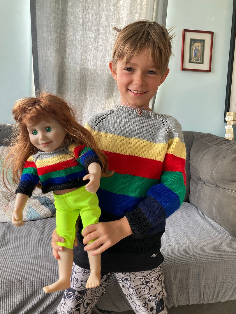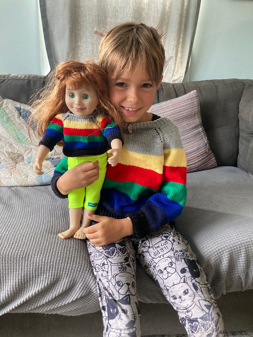 So, in long consultation with MiniMighty, I made her a sweater. She chose a pullover; we worked together on the arrangement of stripes. I knit a little doll version to test out our colour scheme. And then, over summer vacation, I whipped it up.