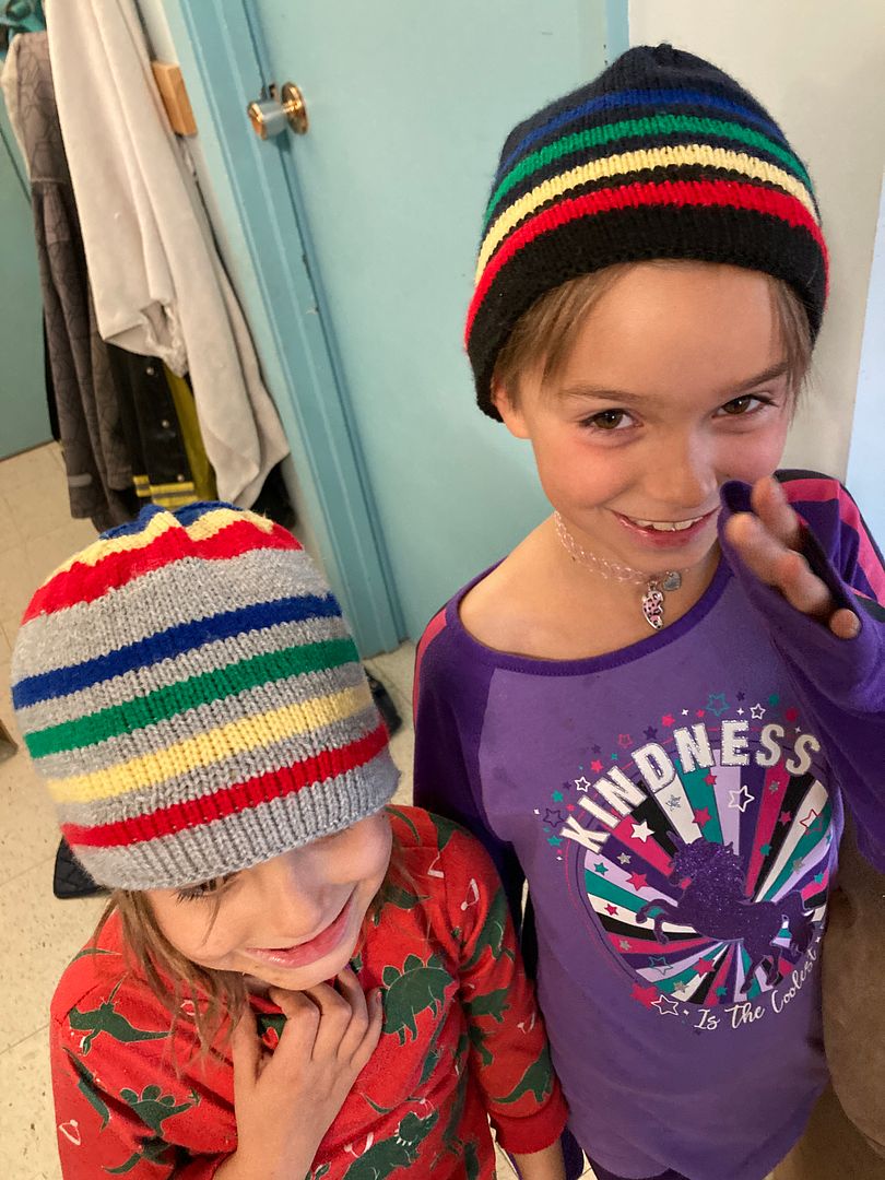 I doubled down on the HBC stripes, with black shifting to navy for the background. And there was just enough left for a coordinating hat for her little sister. I ran out just shy of the tip of the crown, so it’s a little extra rumpled where I pulled 20 stitches taut with the final tail.