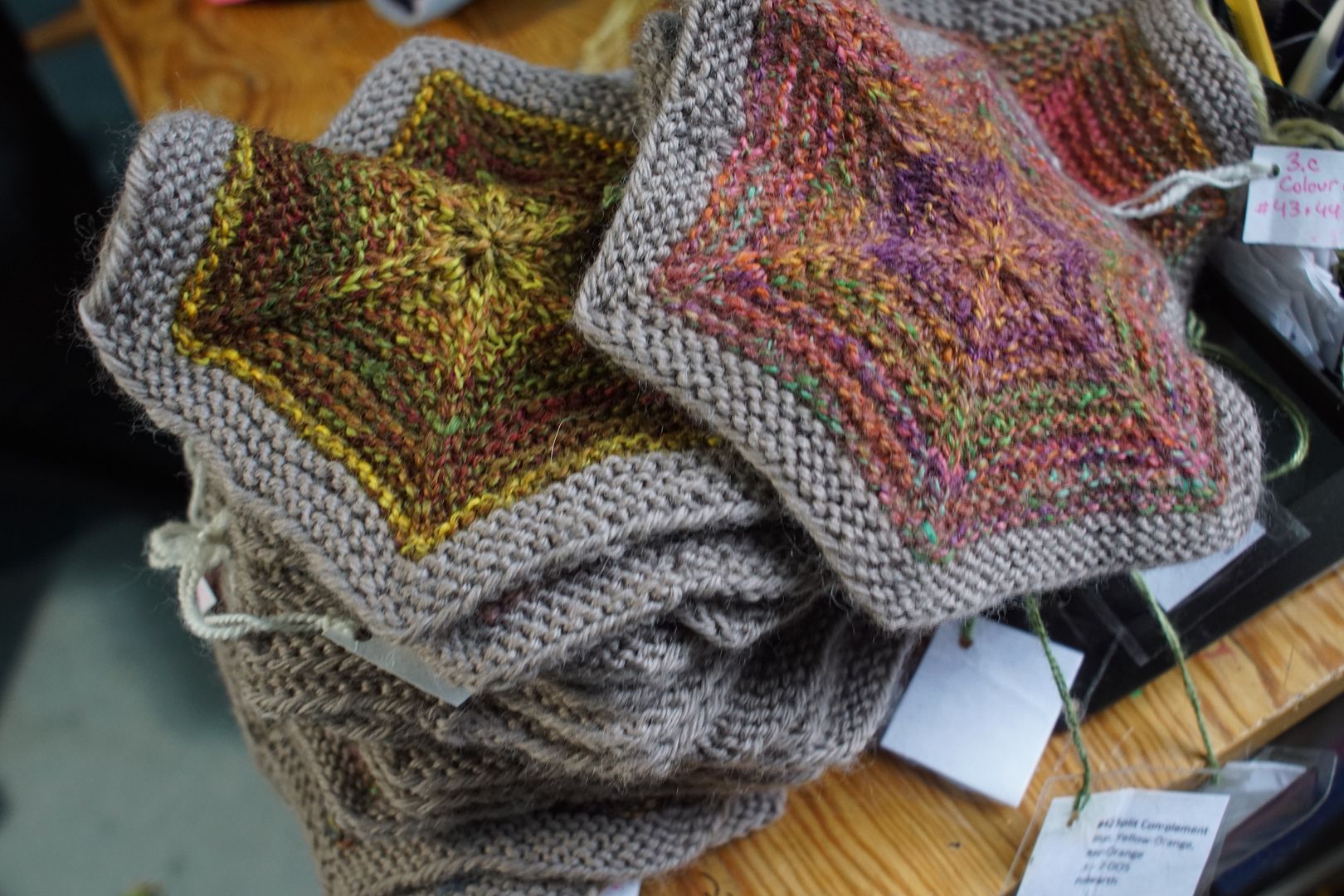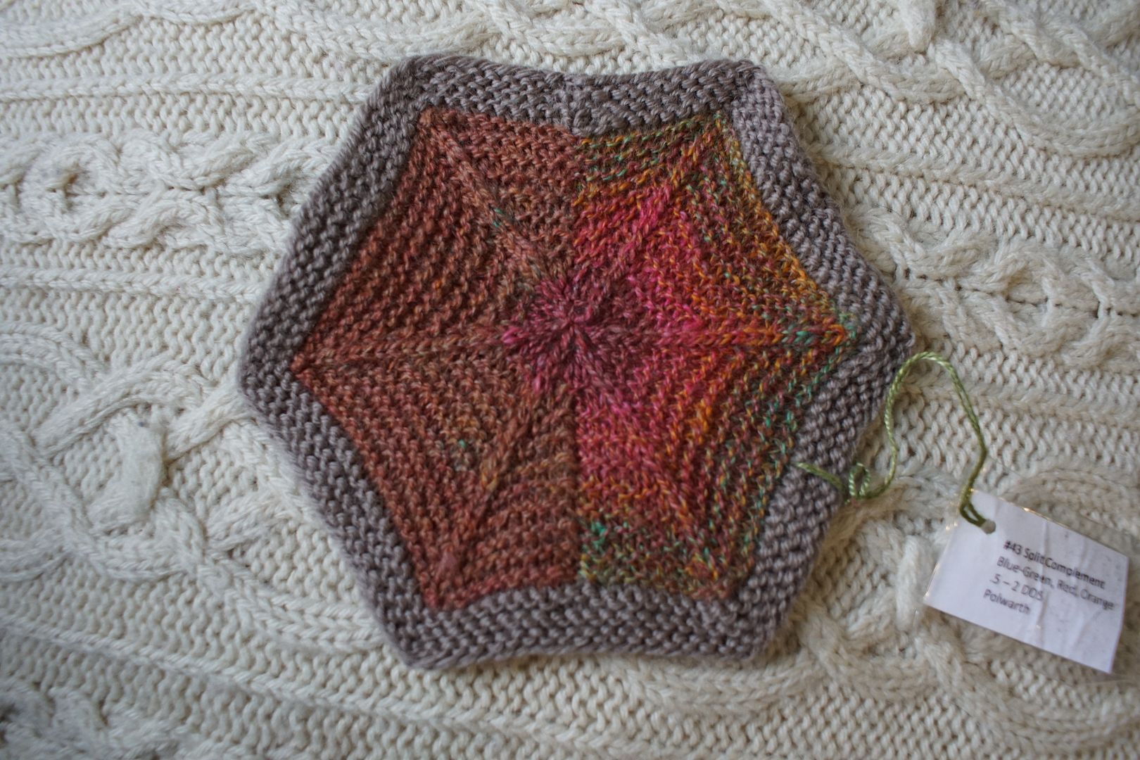 I’ve started hexy-ing up not only the combo draft experiments, but the original samples from the dyed colourways as well. The samples I spun up from the dye experiments were generally much smaller and finer, so adapting them into the same size of hexagon has involved some trial and error. Some of them I knit from the inside out; other colourways come in pairs and I can knit them together using intarsia and working them flat. Take, for example, the colourways which I spun both as combo-drafts with themselves, and combed into a total blend. This is one of the split complement colourways. These. are. so. fun.