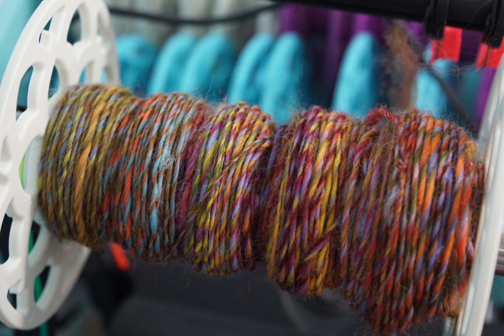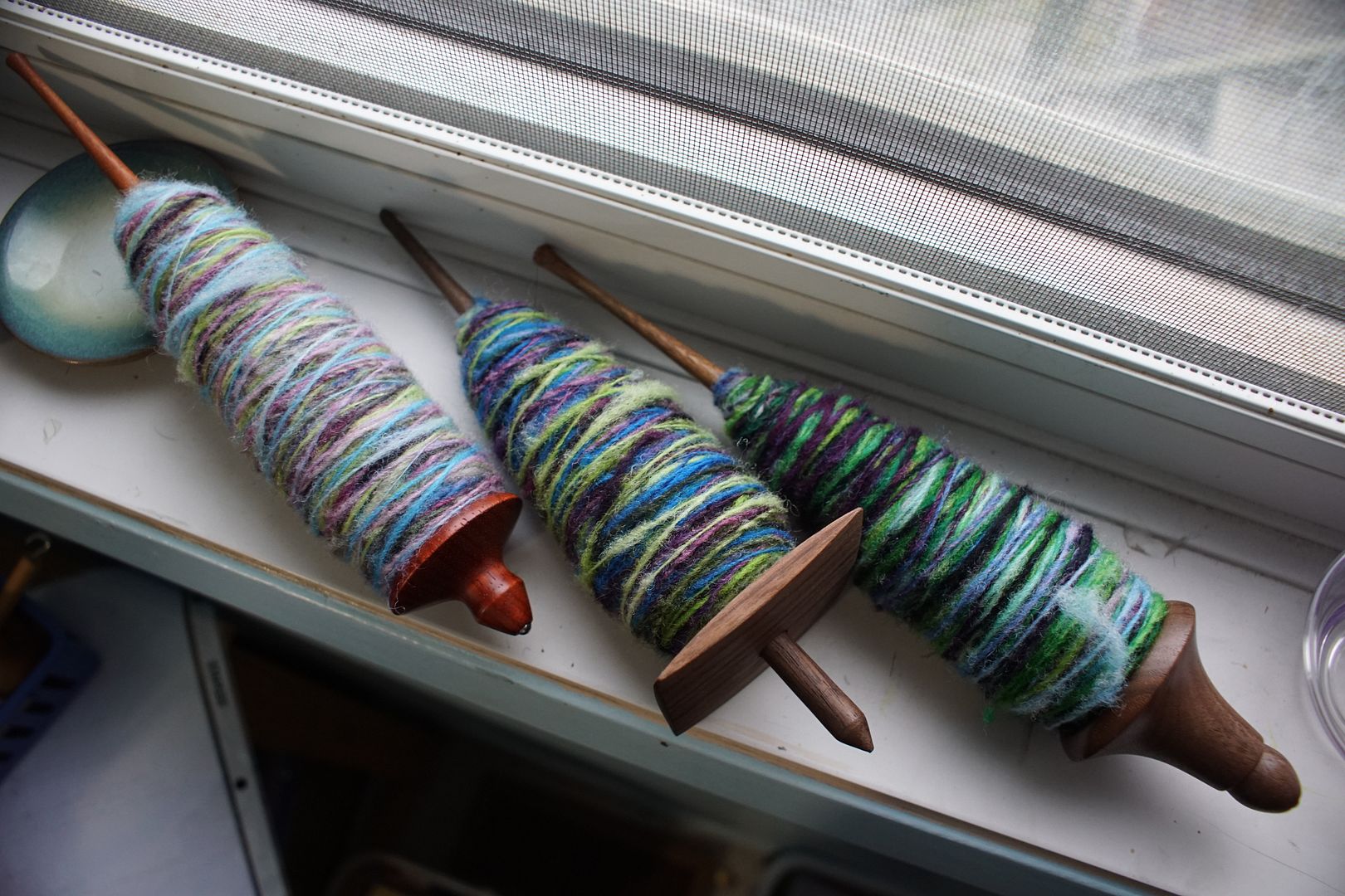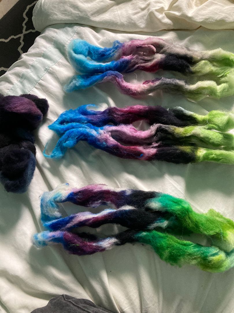 These colourways are the same, but the leftmost spindle (and topmost roving) was dyed at .5% DOS, the middle was dyed at 2% DOS, and the leftmost spindle (and bottommost roving) was space dyed with 2% DOS. I’m thinking to chain ply each of these to keep the colours distinct, then use them together in something.