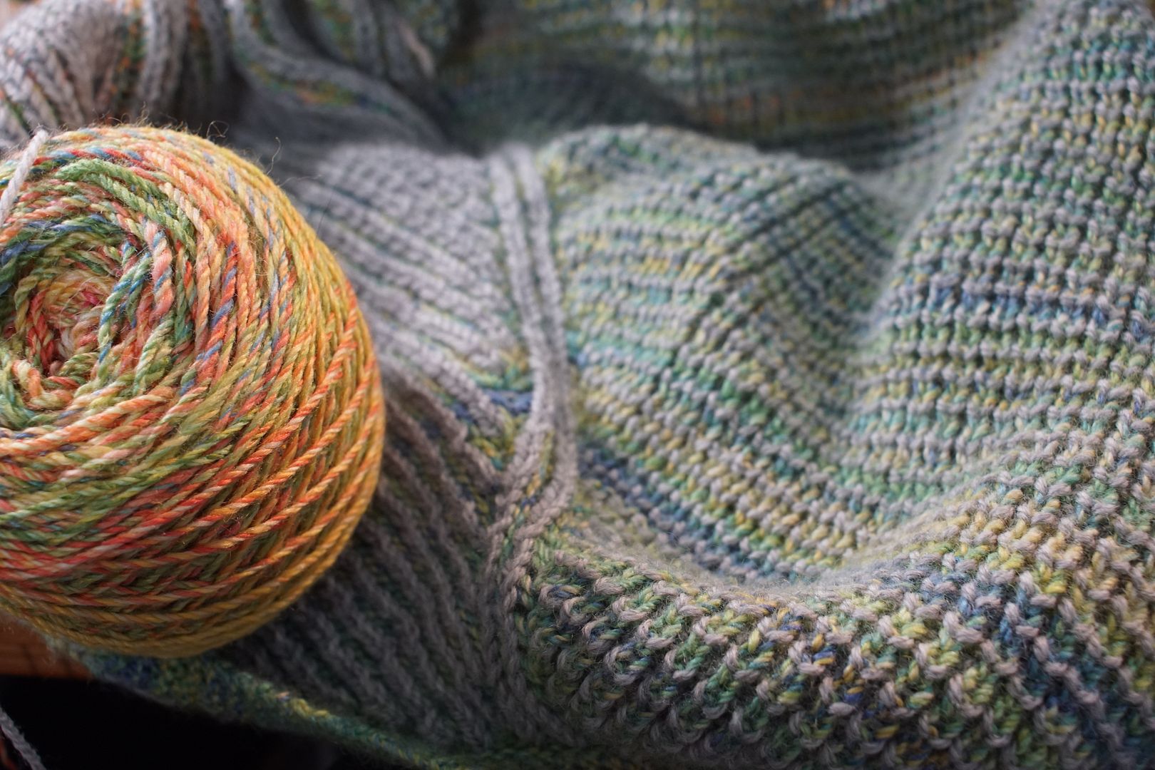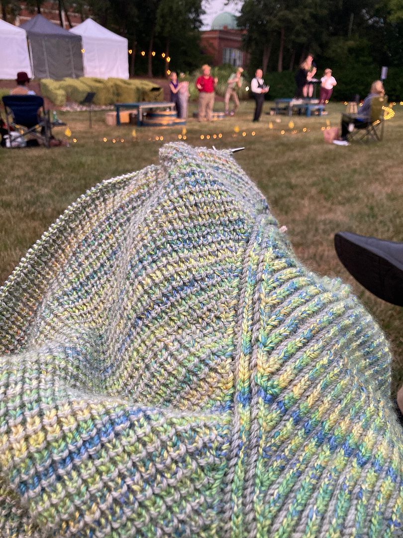 During vacation, I knit through one of the four skeins of colourful handspun I have devoted to this project. In my new phase of using up yarn, I intend to keep going on this shawl until all that handspun is used up. So I can now say with some confidence that this shawl is going to be yuge.