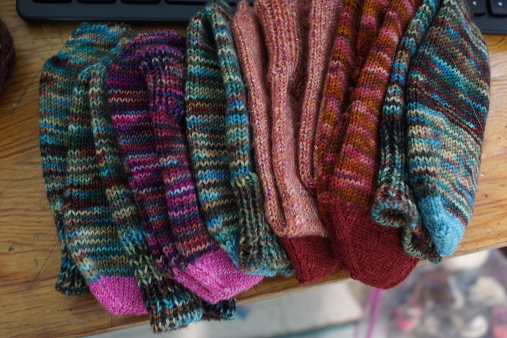 And one more in between thing I got through: I knit the heels and toes on five pairs of socks for the girls. This was better than darning, but still felt like a chore.