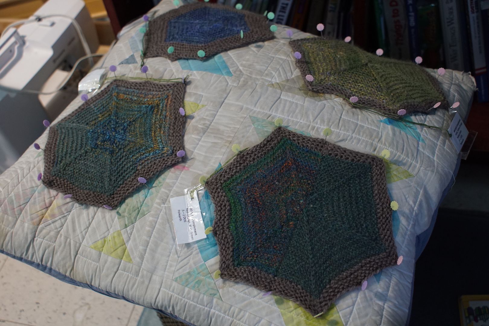 The base pattern is “Skep” by Kate Davies, but I am adapting this pattern every which way. I’m knitting it inside out and outside in, flat and in the round, often changing gauges halfway through. I’m in a groove with these guys. I have maybe 20 hexies left ’till I’m done the hexies belonging to the original dye experiments, and then I’ll switch back to knitting hexies from my spun samples. When I’m done with the dye experiment hexies, I’ll start posting them here. Expect it to be very organized.