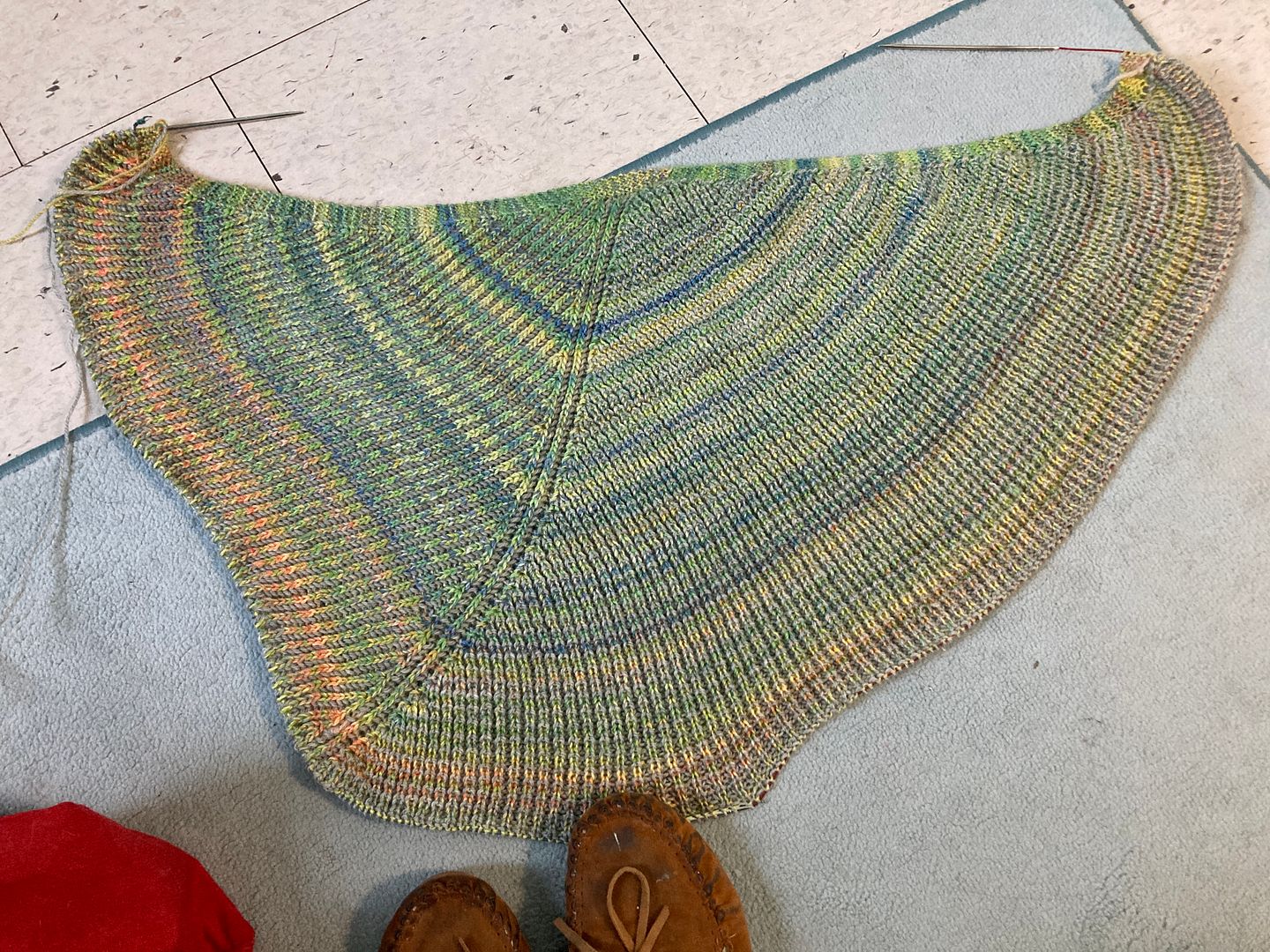 The SPAKAL officially ended halfway through September, but I hadn’t made much progress. I’m not much further now, and the whole thing is jammed on a 24″ needle because my longer interchangeable needle was causing my stitches to catch at the join. I work on it when I’m in between hexies and secretcessories, so not very often, but I’m halfway through the second ball. When I’m done that second ball, I’ll switch to garter, which will be even more mindless and speedy. I’m looking forward to that. The brioche is fine, but the fisherman’s rib section I find a bit annoying.