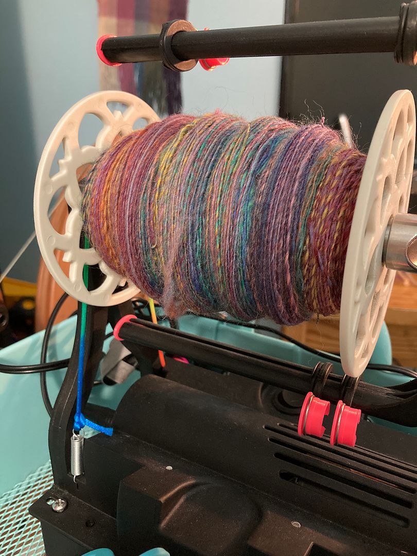 I’ve been spinning a lot this month. A lot of it is for self-imposed deadlines, and at those moments, more and more I find myself reaching for my electric wheel, the EEW6. It’s just so efficient; it’s on a cart I can roll around, and I can slouch in whatever position I want while spinning.