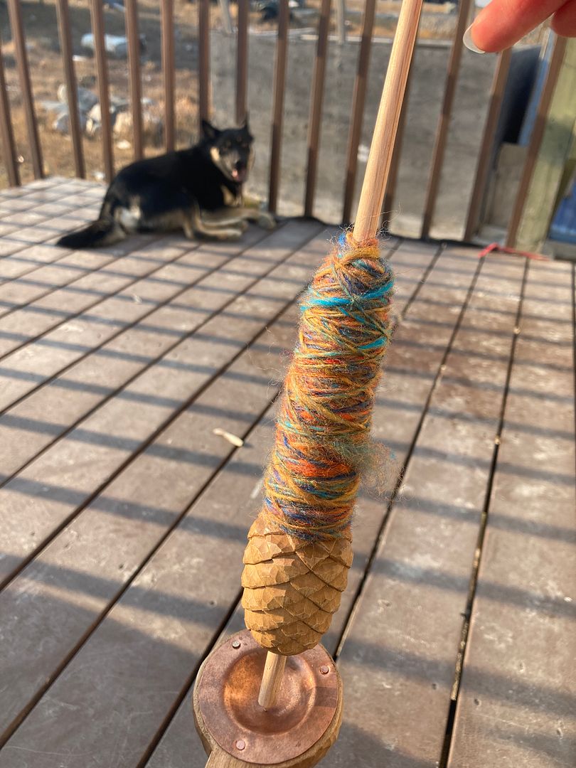 As a last-minute impulse buy, I asked for a pinecone spindle he’d already made to add to the order. I’m really glad I did; this thing spins so nicely. The heavily carved spindle has a little bit of wobble; many of my spindles do and work fine. But it makes sense, since the heavy carving means the whorl isn’t perfectly balanced. But this pinecone! I could spin on it all day. They both have plenty of weight, which feels good. I love using the spoon as well, but I forgot to take a photograph of that for you. Another day.