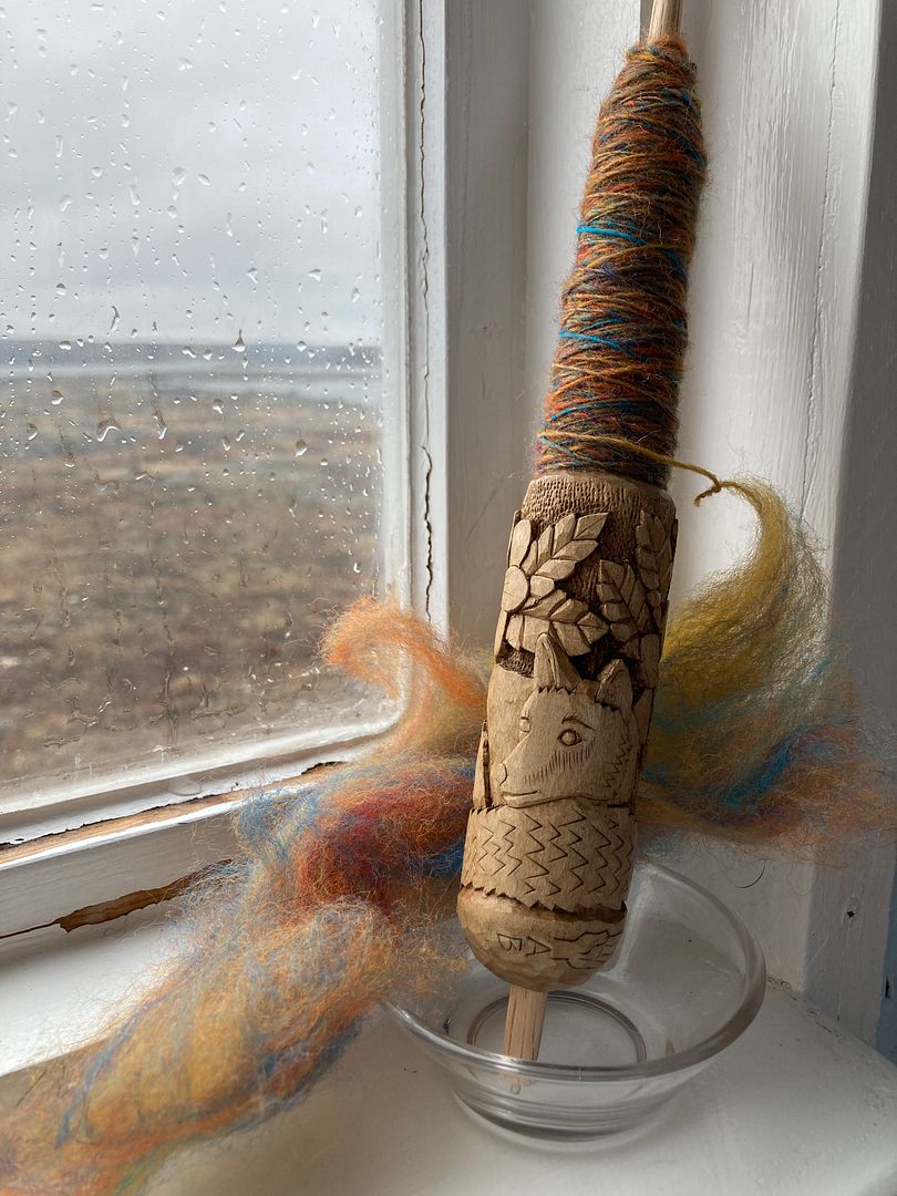 There has been some spinning that’s just for fun, though. Six months ago, when I first started seriously support spindling, I put in an order with Allen Berry. He’s just a wood carver on Instagram who does custom spindles and other tools. I asked him for some Arctic flora and fauna on a support spindle and a spinning spoon. Here’s the spindle.