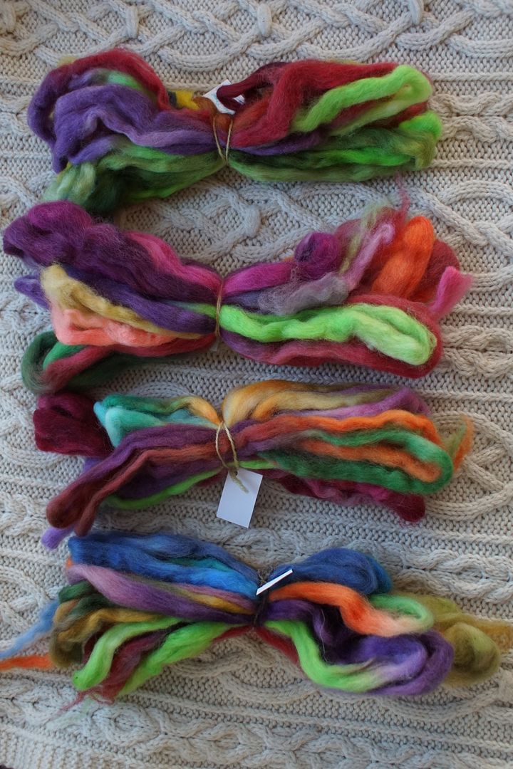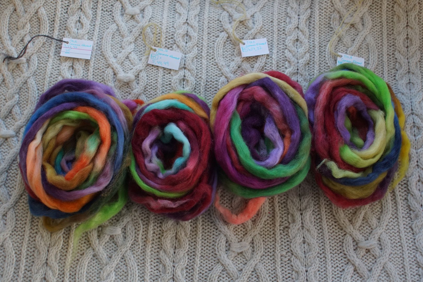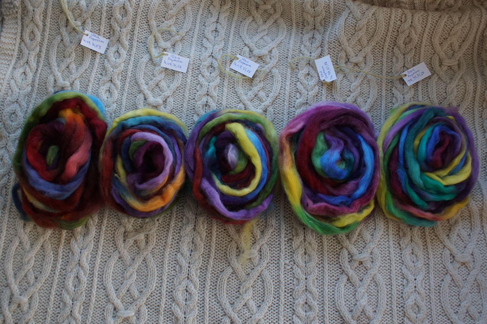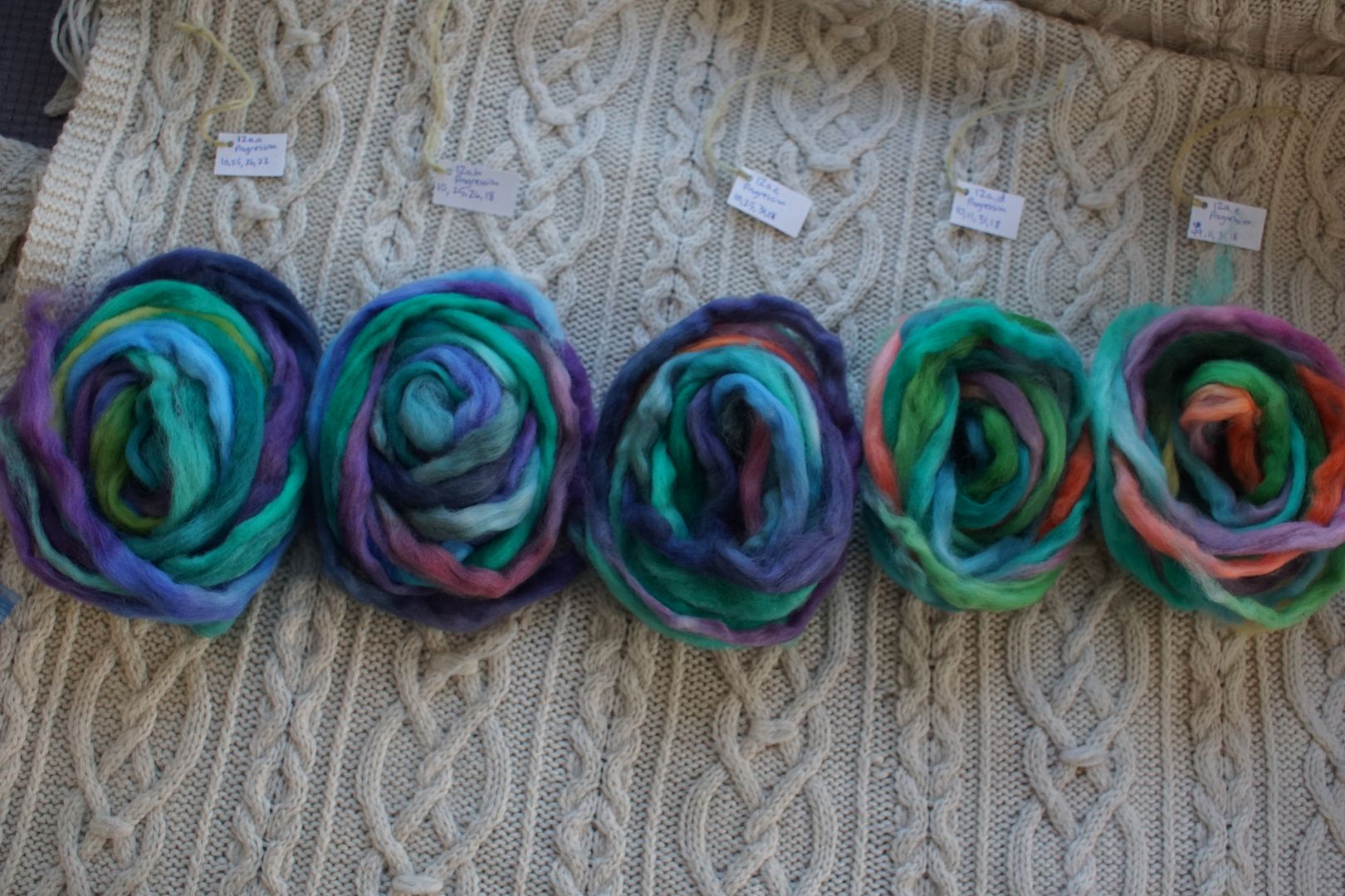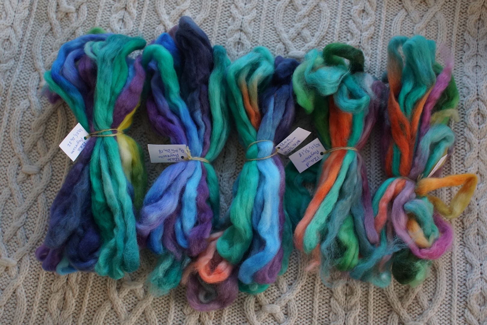 I decided to make four series of yarns, all sort of progressions in their own way. Two would be from groups of fiber that all had one handpainted colourway in common; two would be true progressions in a series. For each, I ended up with a red-themed one and a teal-themed one.