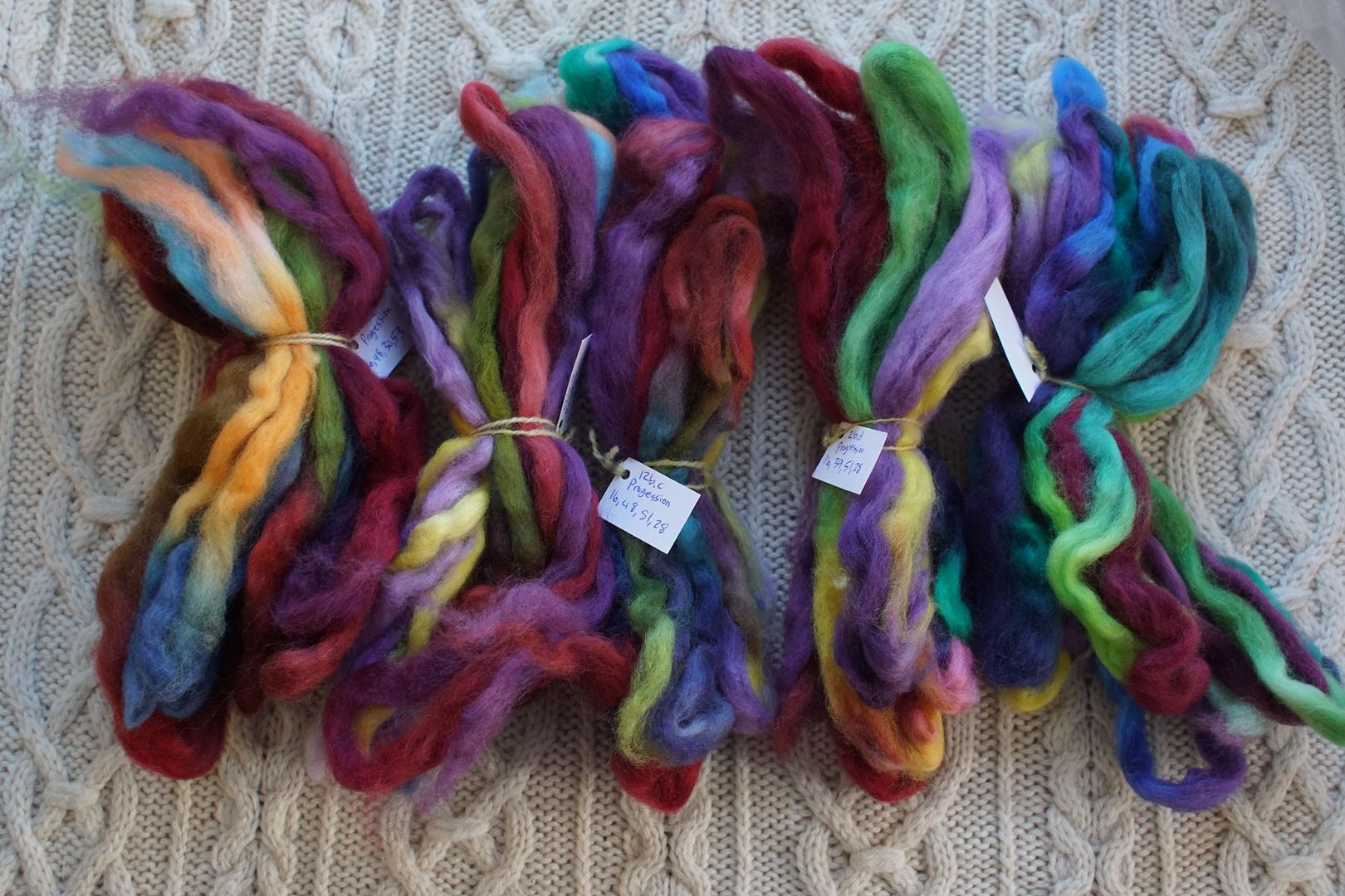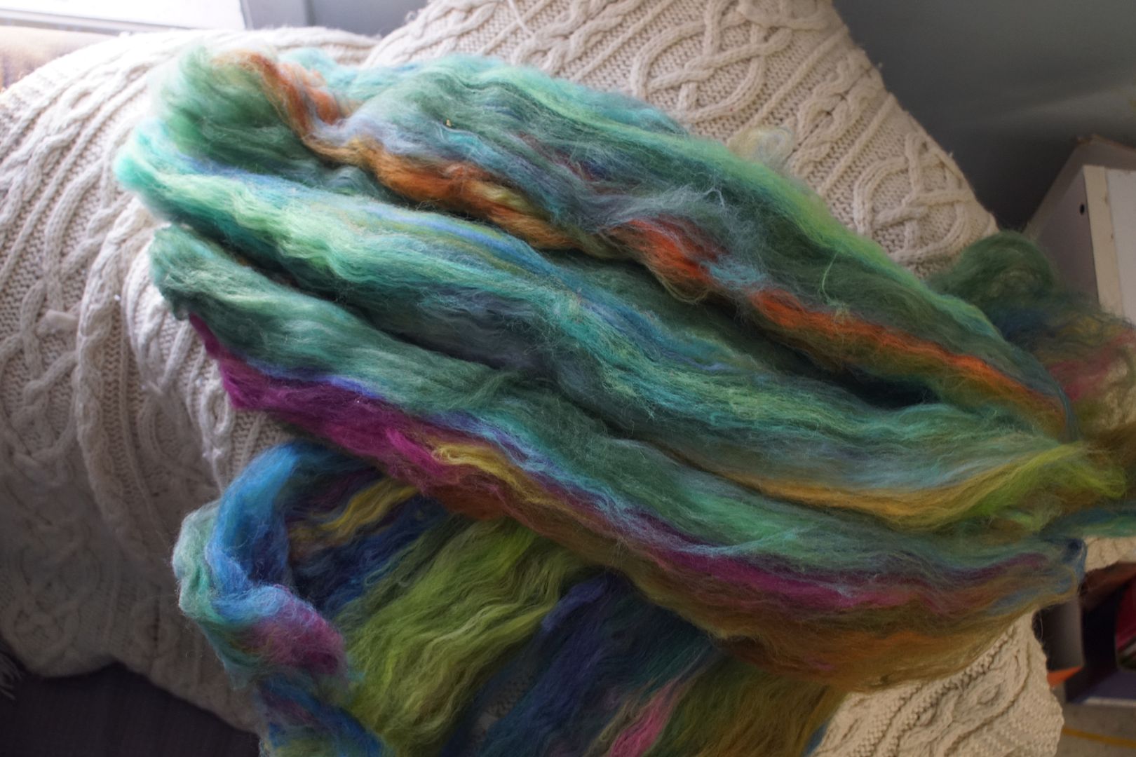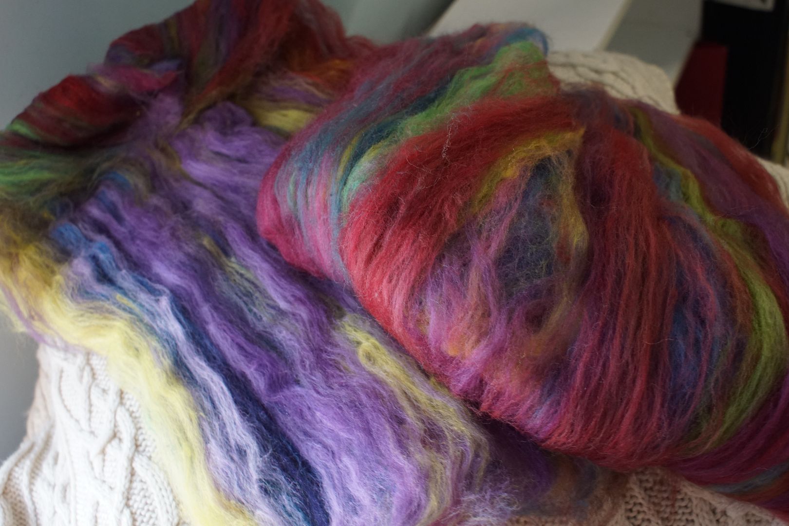 To prep these, I borrowed Alide’s drum carder to make batts. I wanted to make two plies with everything represented, so the groupings of fibers line up in plying, but still give me one large skein at the end. I go through this whole process on the Wool Circle, episode 110, but I did take pictures of the finished batts!