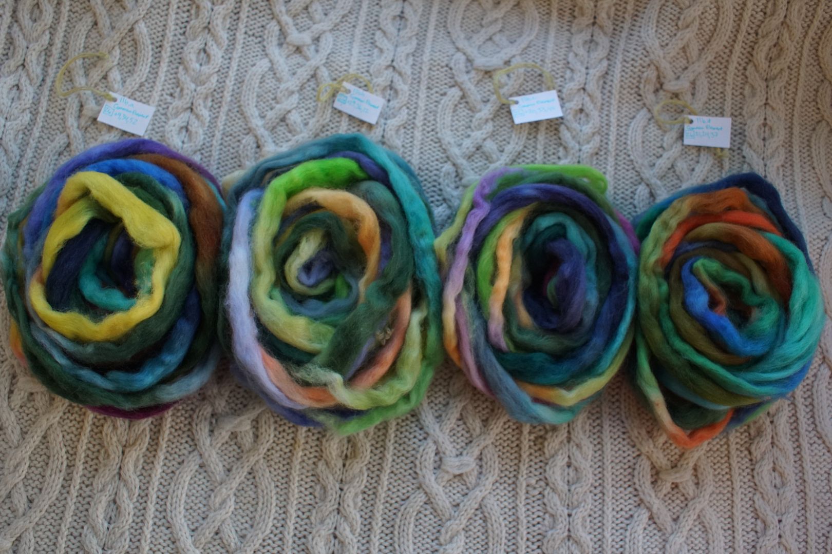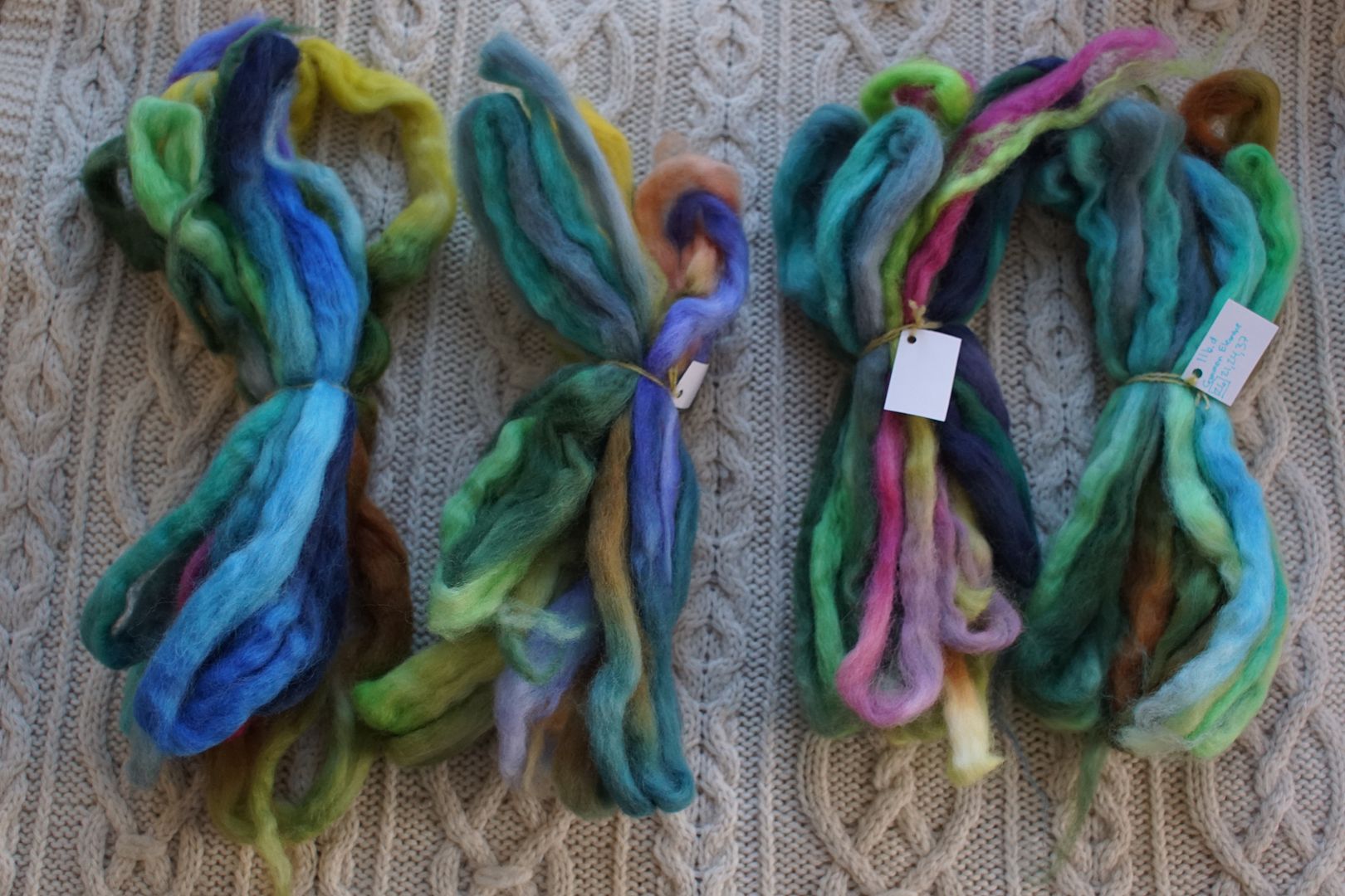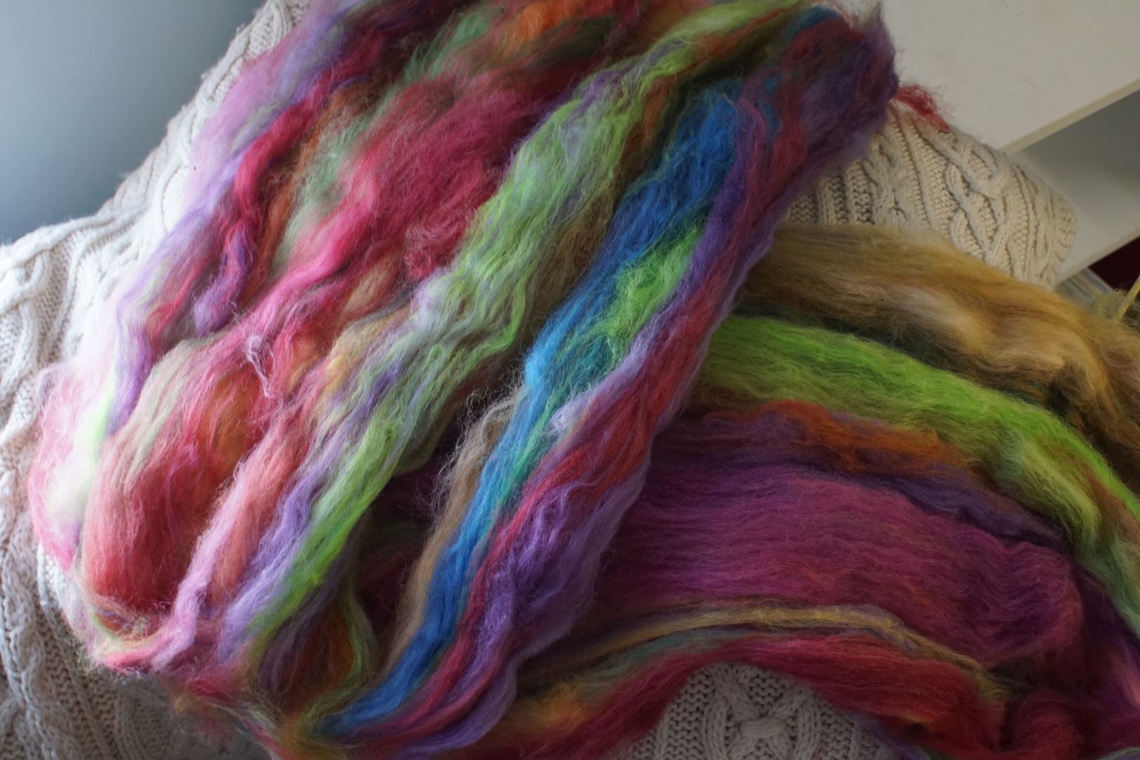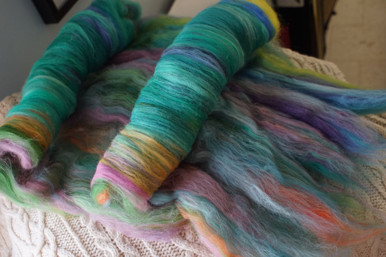 To prep these, I borrowed Alide’s drum carder to make batts. I wanted to make two plies with everything represented, so the groupings of fibers line up in plying, but still give me one large skein at the end. I go through this whole process on the Wool Circle, episode 110, but I did take pictures of the finished batts!