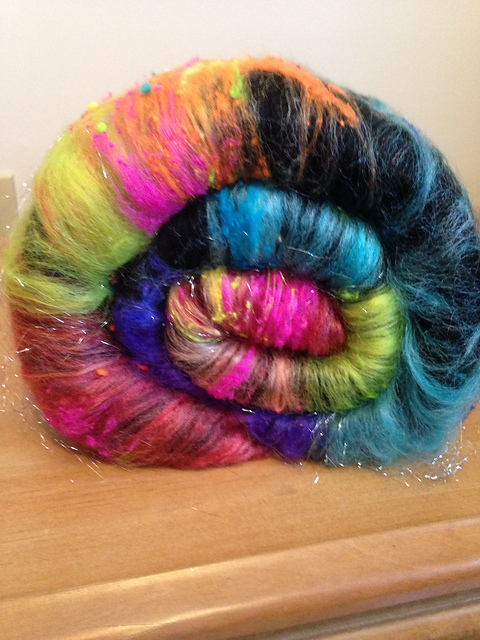 The club fiber: a black batt covered with a rainbow of silky textured mix-ins.