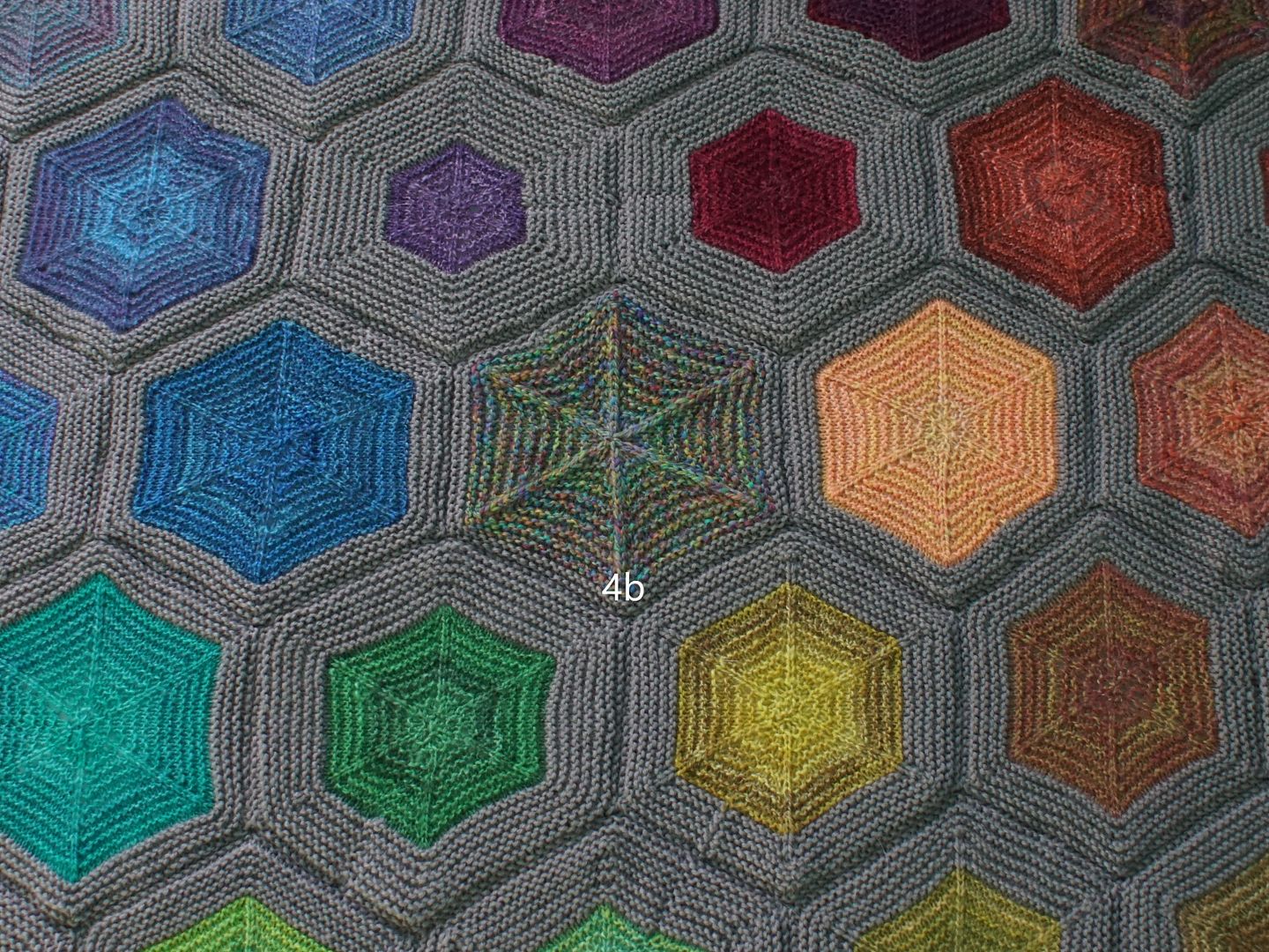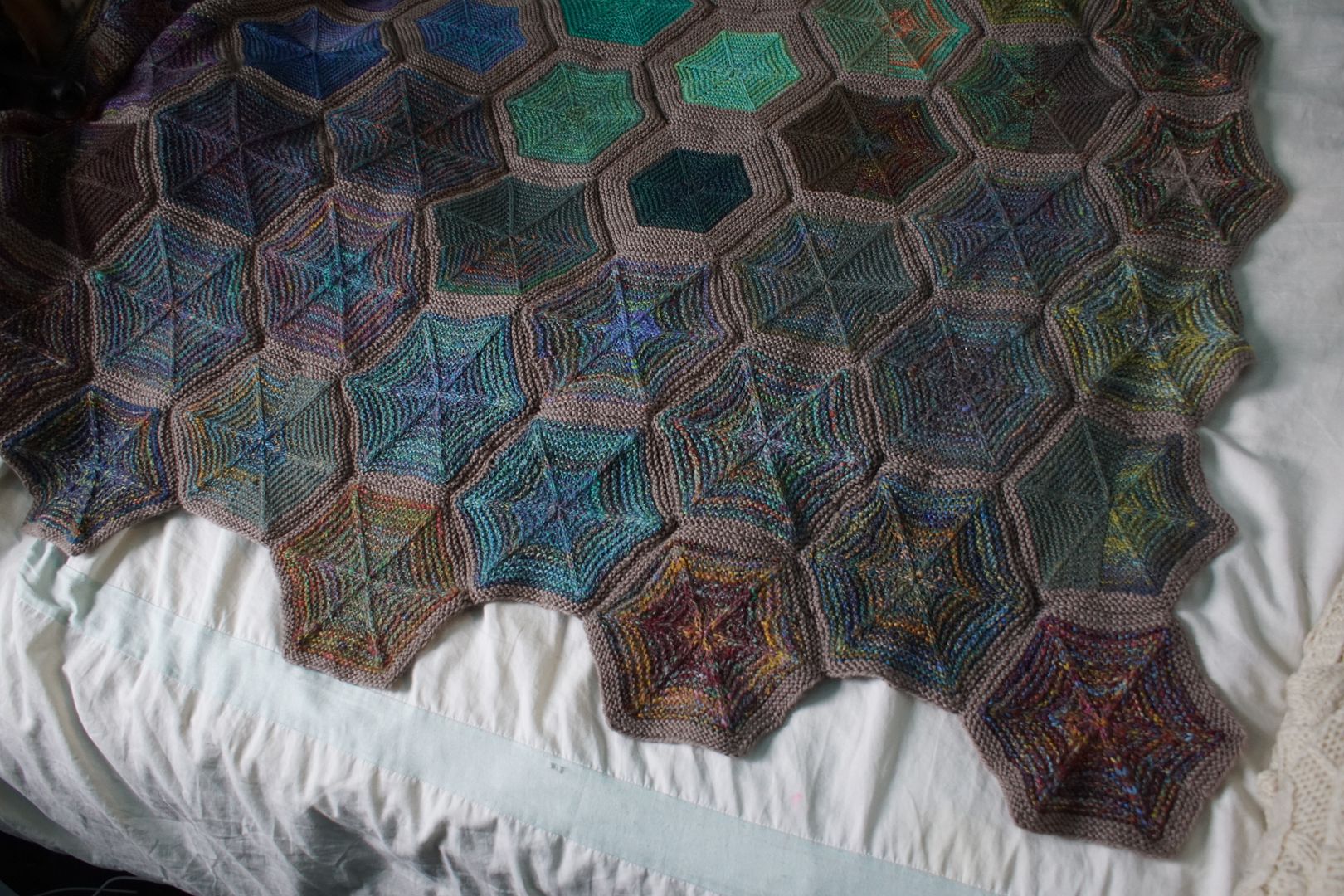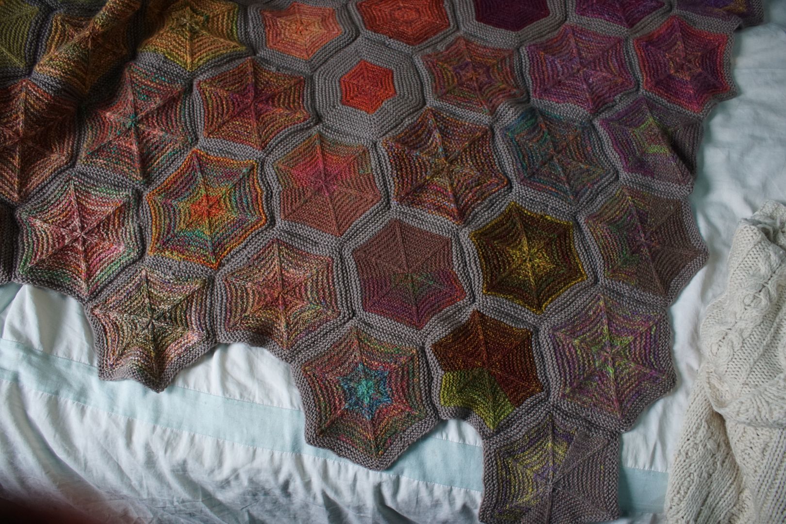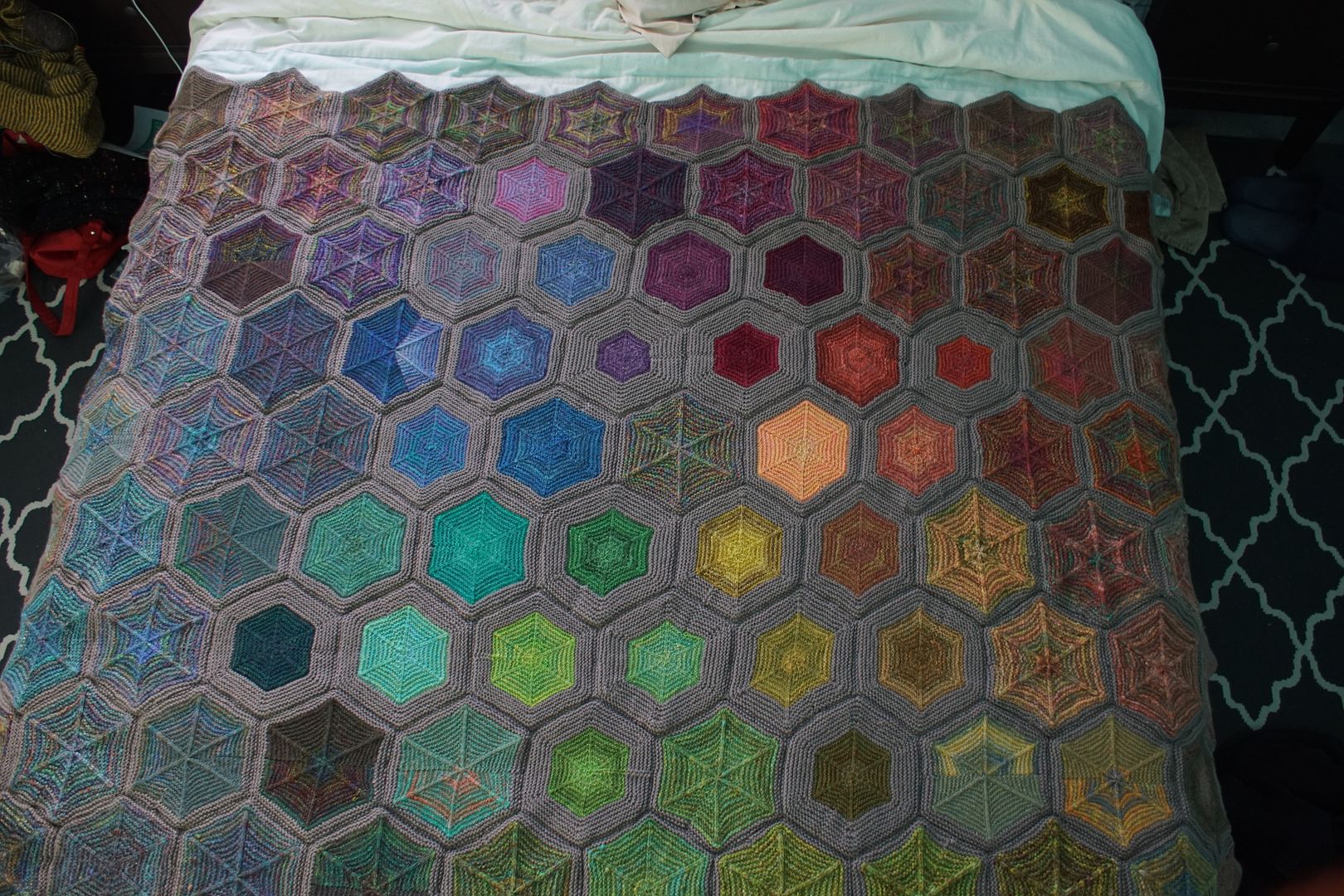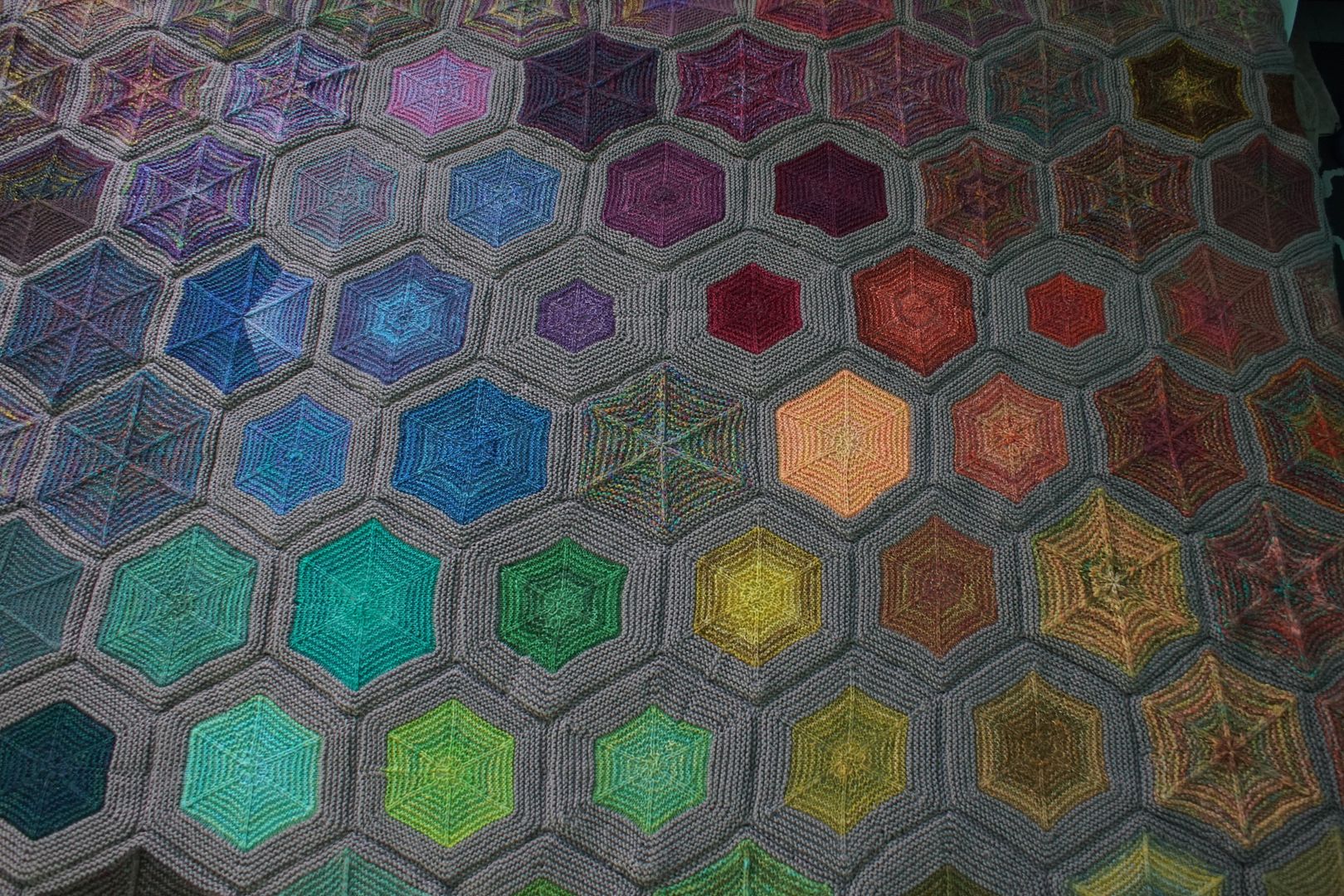 After months of planning, dyeing, spinning, knitting, cataloguing, vlogging, with a finishing touch of lots of sewing, my Year of Colour project is done. 110 hexagons: 51 from samples spun from single colourways, and 59 from combo drafts of different colourways.
