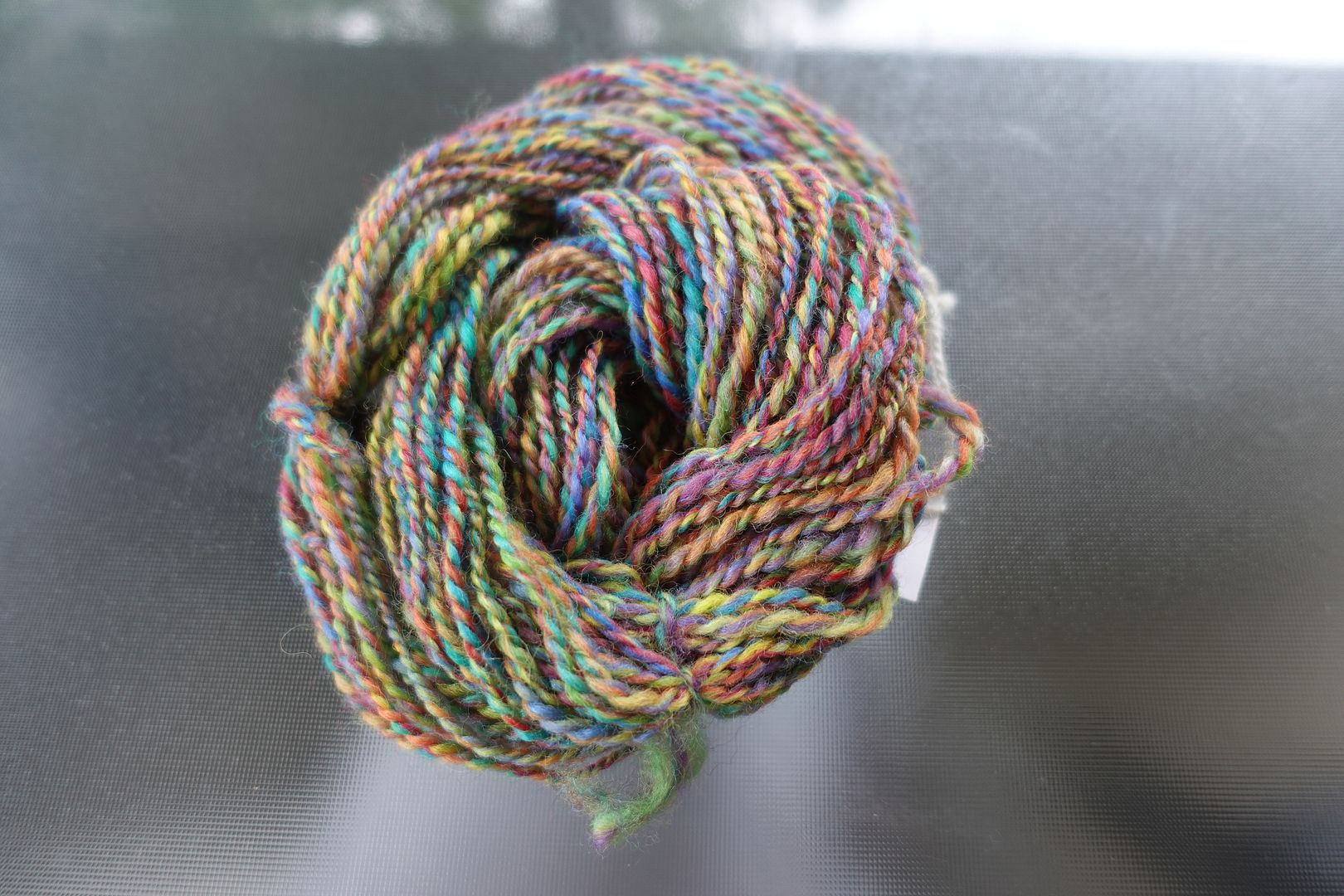 6. Contrast of Saturation: Saturation is about the depth of colour. A pure hue is most saturated, and you can desaturate a number of ways – by adding white, black, or grey, by simply using less dye, or by mixing hues distant from each other on the colour wheel. Looking at the fiber, I will describe how saturated different colours appear to be.