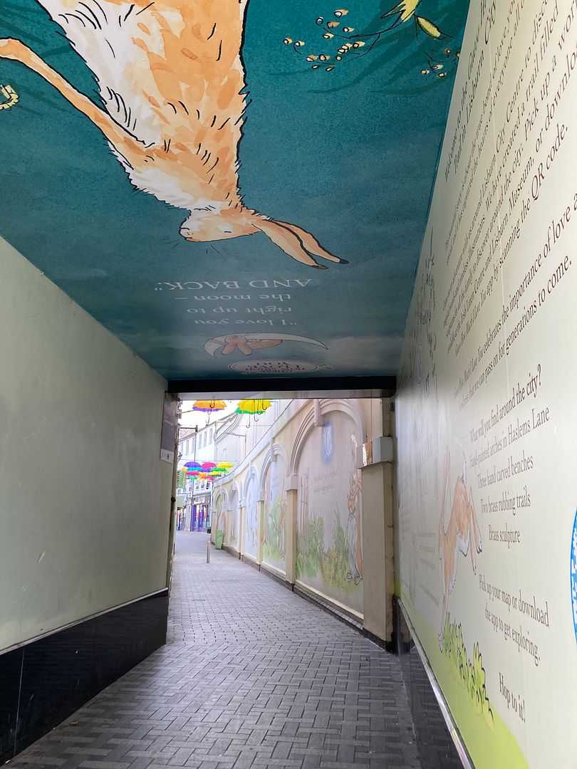 Lisburn was also the home of Sam McBratney, a teacher best known for the children’s book, Guess How Much I Love You. I remember first learning about this book from our friend Liz, who had kids long before we did, and framed pages from it on her kids’ walls. So we got our own copy that we enjoyed when the girls were small. Lisburn has a commemorative walk for kids, a sort of treasure hunt with pictures to make rubbings of, with statues and artwork from the book all over the place.