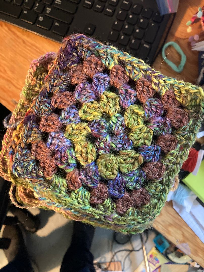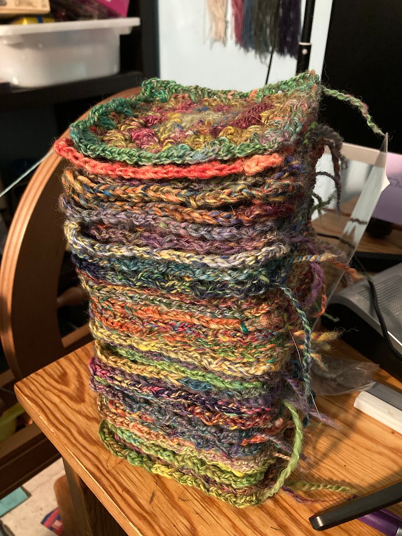 I had this huge bag of scraps from my Skep blanket, almost 8 ounces! And I collect my other handspun scraps as well. I spent the next three weeks or so converting those scraps into 36 five-round granny squares. They were completely addictive and so much fun, and I was actually sad to have to stop, as I don’t have a main colour yet to finish the project.