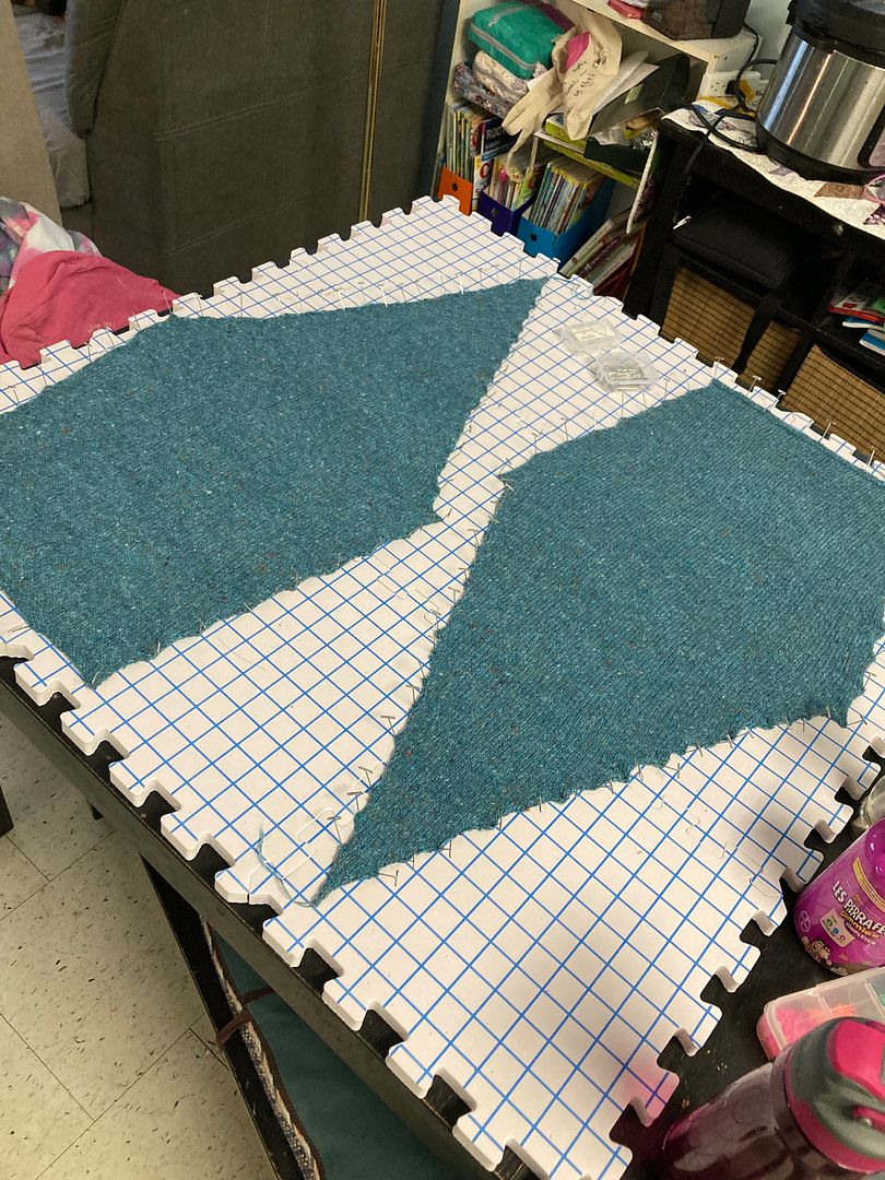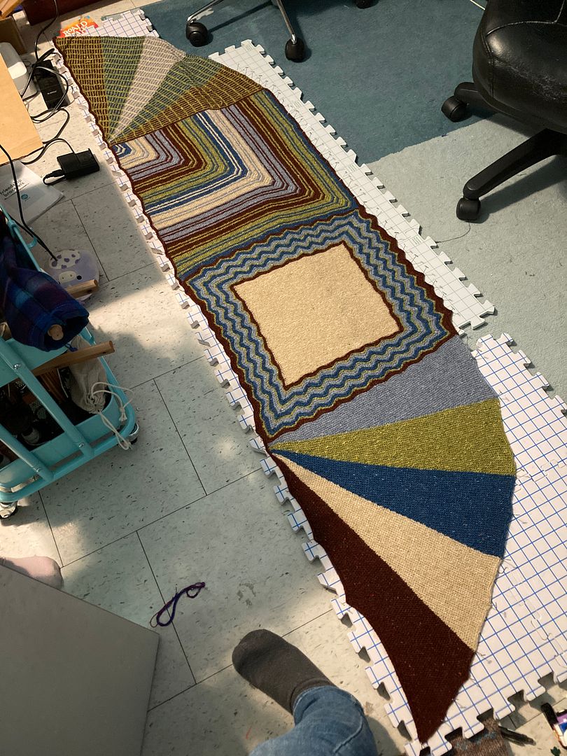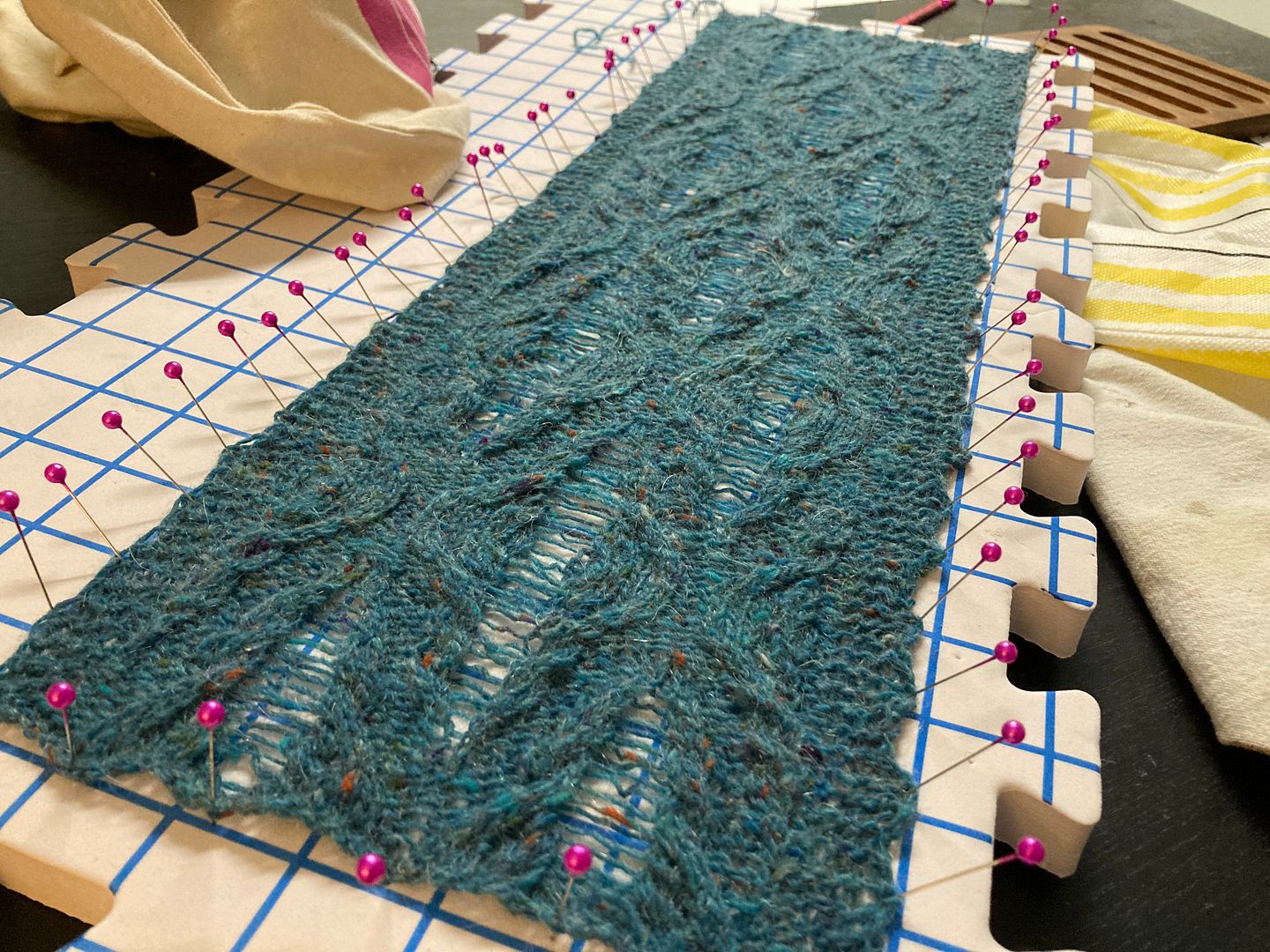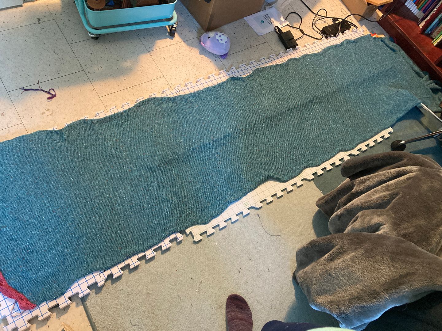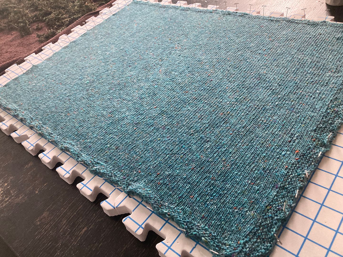 With the oil removed, I could properly measure the gauge. I did not have the pattern with me when I was at my mom’s, so I had estimated the size of the panels I would need. The width I could not control, but the length I could. It took a good bit of work, but I split the huge panels into four smaller panels, added garter stitch borders to three sides, and aggressively blocked the bias out of them.