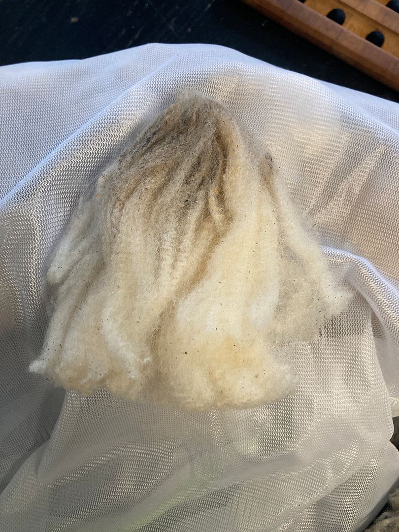 I washed three big half-fleeces at my mom’s house this year: a Clun Forest, a Tunis, and a Wensleydale. They’re gorgeous and I can’t wait to get my hands on them to dye and blend and spin. They also motivated me to wash up all the bits of fleece that have fallen into my hands in the last while. I’ve already washed some BFL from Kelly a few years ago and some Corriedale from Dionne a couple years ago. This is some Corriedale I pinched off Rachel from a fleece she just bought at Knit City: