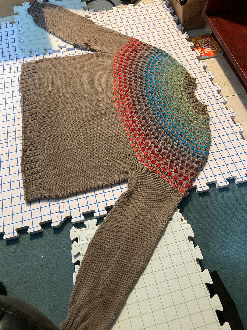 All that remained was to hand-knit the sleeves. I really like knitting sleeves flat 2-at-a-time, because even though it takes a while, when you’re done you’re done, and if you mess up the increases, you can at least mess them up in a synchronized fashion so the sleeves match.