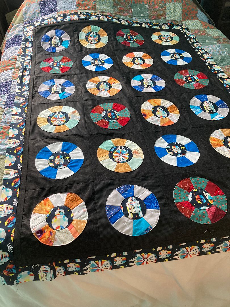I did have a few moments of sewing in September, as I was in a finishing-things-up sort of mood. The real big finish was MiniMighty’s quilt top. I had made all these little Star Wars themed frisbees before vacation, and all that remained was to topstitch them to black squares…