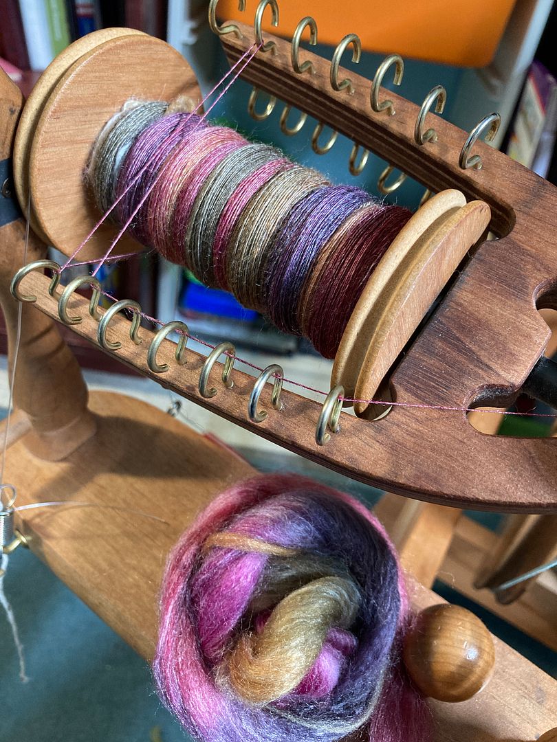 This really belongs down in Fiber Prep, but this is going to be the main colour for my Jethro. It’s about equal parts Clun forest, Romney, Merino, and Alpaca, all from a destash with a long story I’ll share later. About half the alpaca – so 1/8 of the total fiber – was a gorgeous chestnut brown, which should give the finished yarn a heathered cream appearance. I’m so excited to start spinning this, but I have a couple other spins to do first. More on those below!