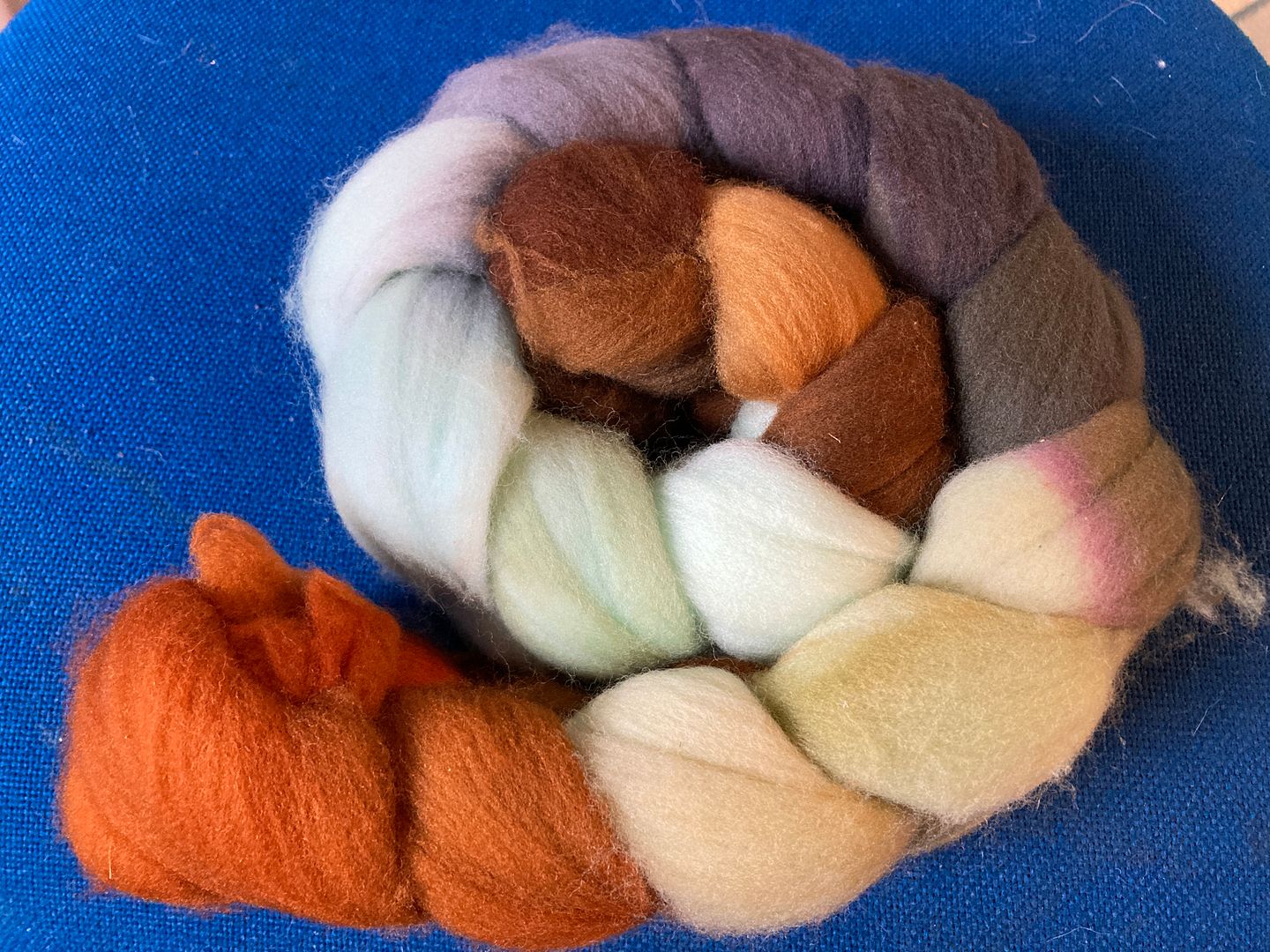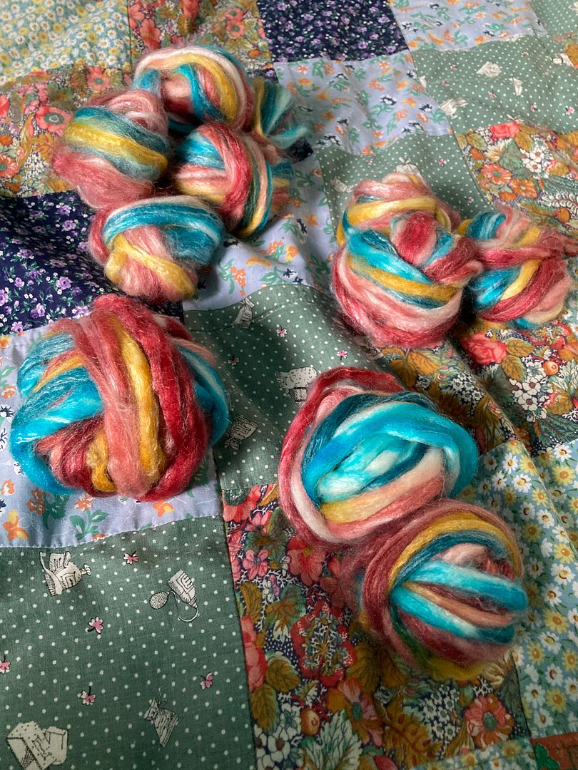 Speaking of snack spins, this was one from last week. We had such a good time digging into chain plying in the last episode of the Wool Circle, and I got so much feedback and new ideas, that I decided we weren’t done workshopping the topic. I needed more singles so I could play with more chain plying techniques. So I reached for this braid, which I had acquired in a fiber swap and didn’t have any idea what to do with. It was the perfect braid to sacrifice in an experiment.