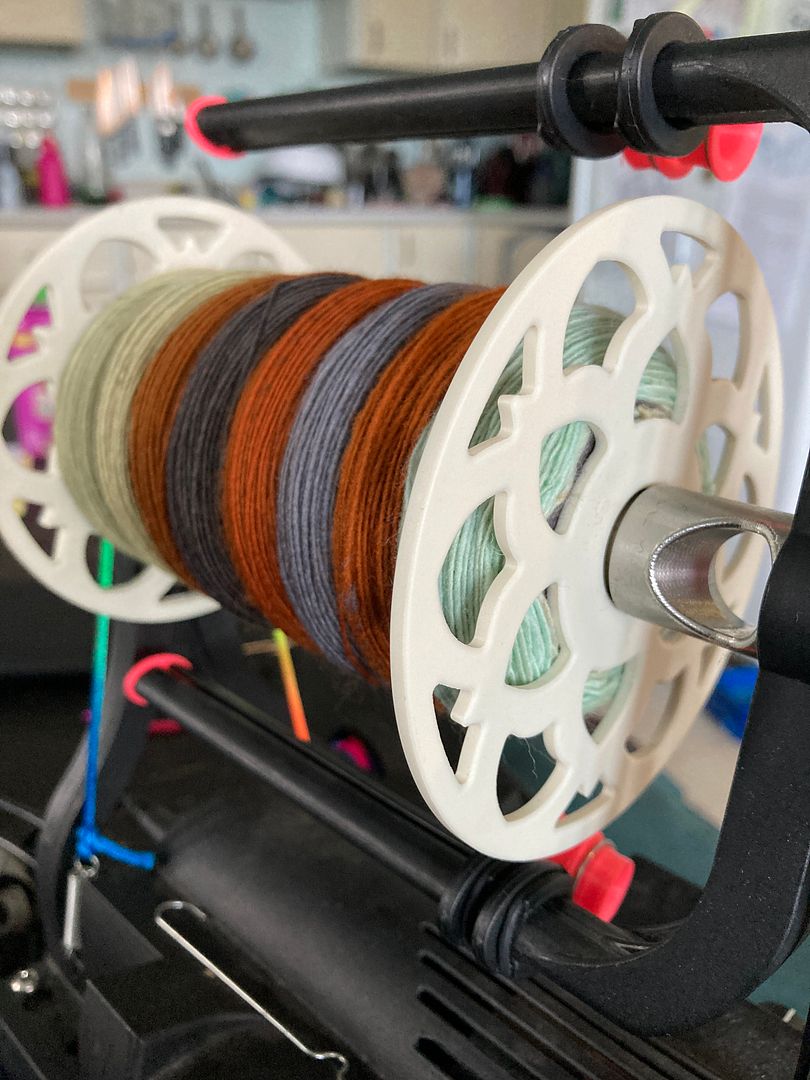 It feels surprisingly amazing to be spinning for socks again. I spun for socks a ton in 2021 and 2022, and I’m almost ready to write about the results of the first round of that handspun sock experiment. (You can see preliminary findings in ep. 125 of the Wool Circle.) I’m ready to start the next stage of that experiment by spinning for six or seven pairs of socks out of the same fiber: a blend called “Panda” made of superwash merino, silk, bamboo, and nylon. Thanks to a shopping spree during the weirdest days of 2020, I have six of these braids.