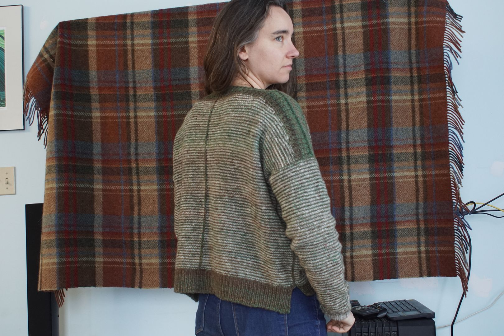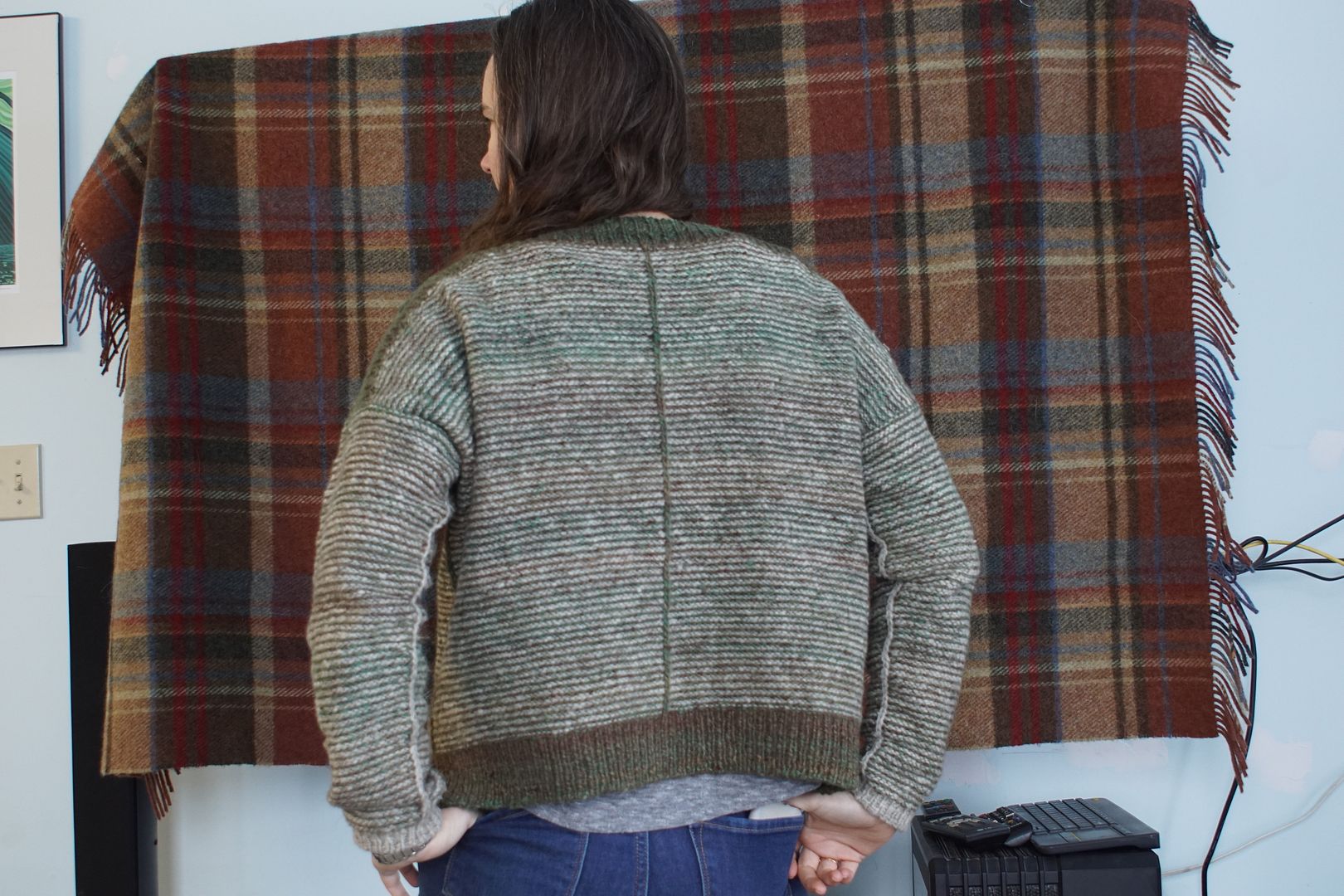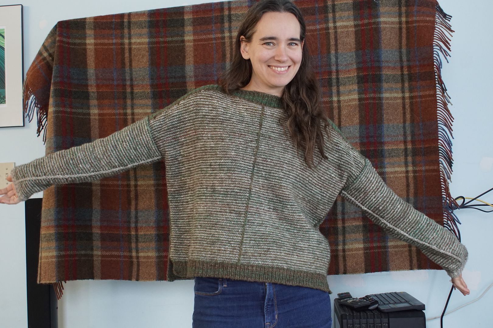 As I said, this drop-shoulder wide-body look is my go-to look right now. I have a sweater quantity queued up for my next big spin, a longwool this time that will drape very differently. I might spin it with this sweater as a general target.