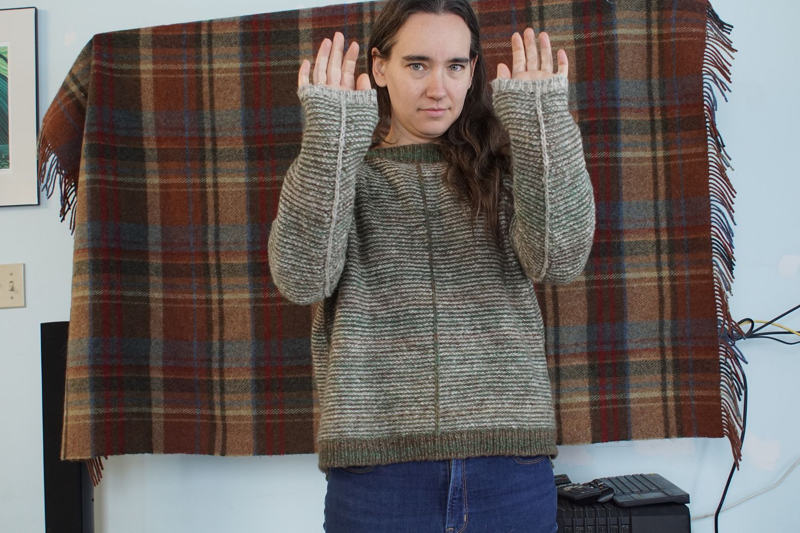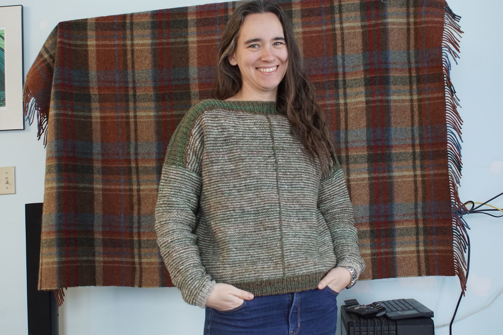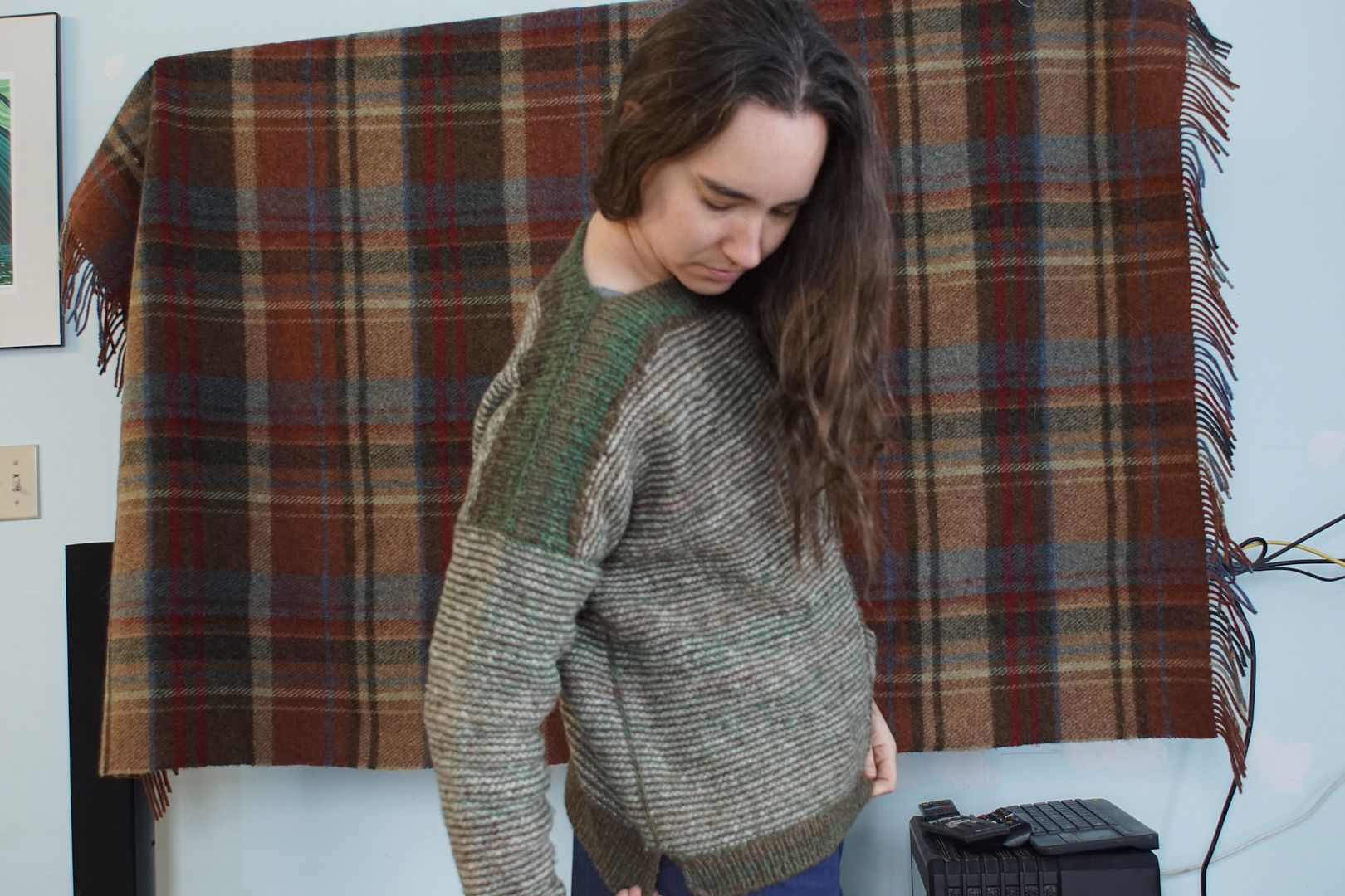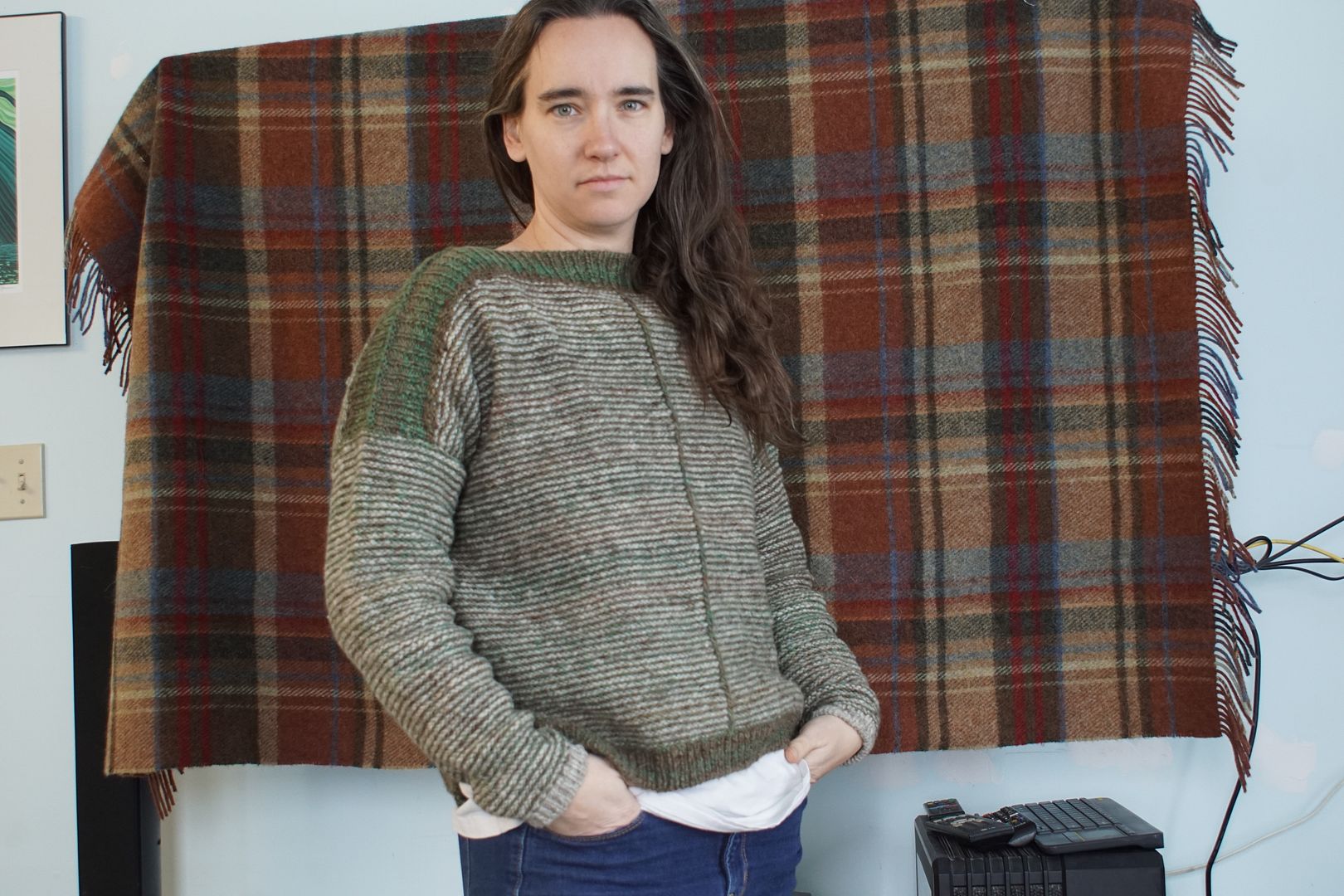 As I said, this drop-shoulder wide-body look is my go-to look right now. I have a sweater quantity queued up for my next big spin, a longwool this time that will drape very differently. I might spin it with this sweater as a general target.