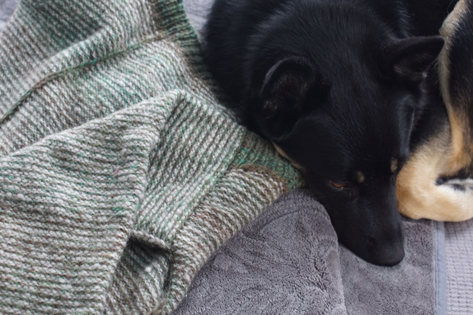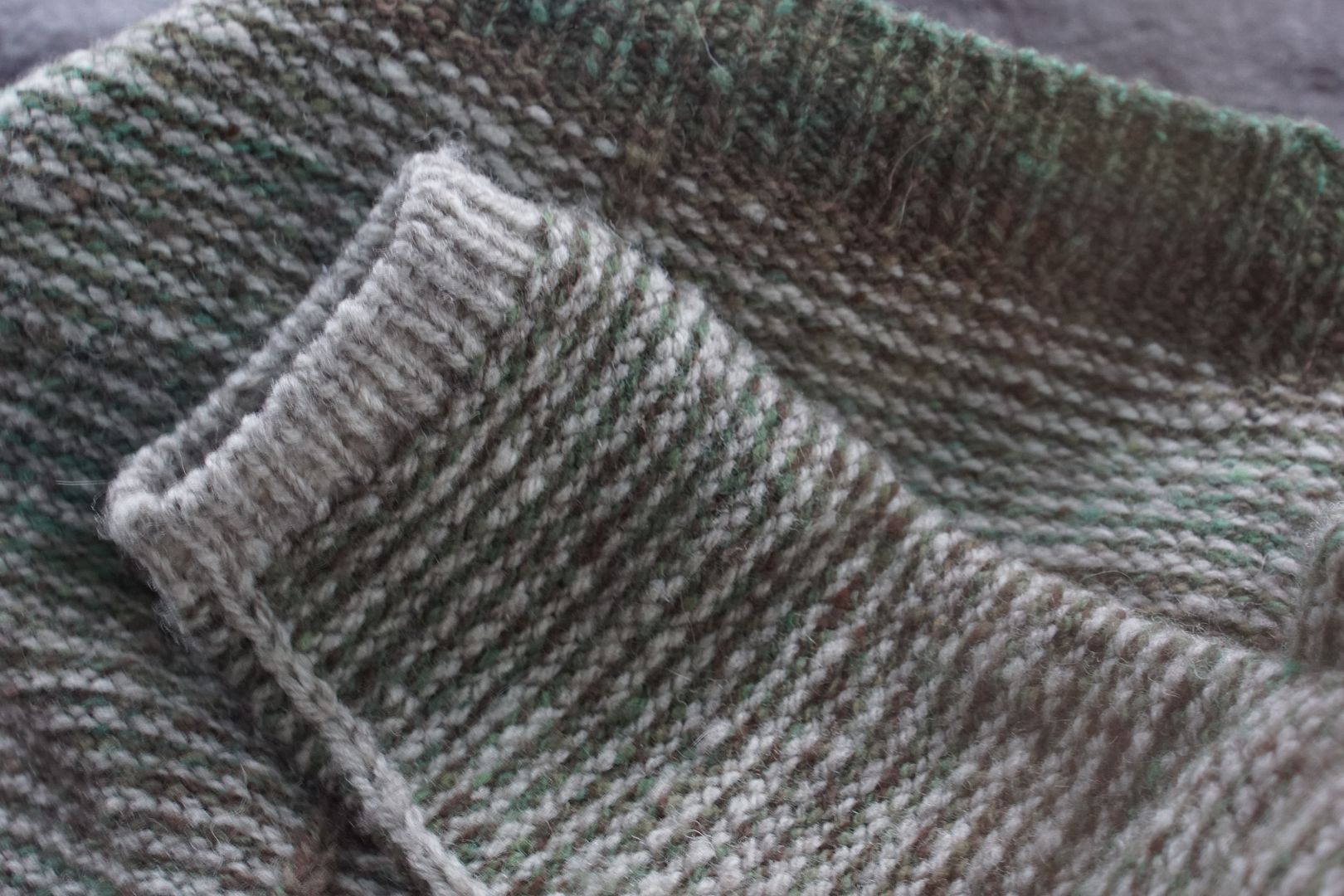 The yarn is definitely soft enough – it’s 1/6th qiviut by weight. The grey is 5/6th Suffolk, a down wool, and the green is 5/6th wool pool roving from Custom Woolen mills. The Suffolk is soft enough; the wool pool wool is not really. I didn’t want to add more qiviut for colour reasons. But 1/6th isn’t really enough to make the fabric feel very soft. It’s perfectly fine for me, but to get these particular wool blends into the realm of what most people would call next-to-skin softness, I’d have wanted to add more like 1/4 qiviut. For me, I’m quite happy with what I got.