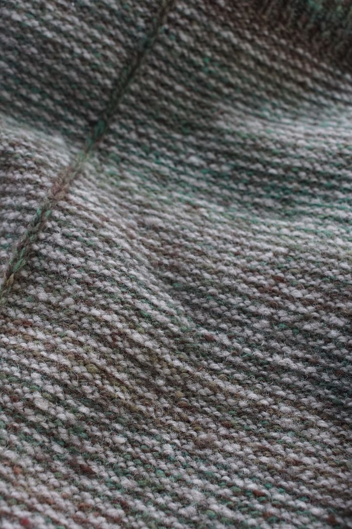 Part of what makes this sweater pattern so great is that it has a wide, boxy shape, which looks especially flattering if the fabric has a bit of drape to it. Being a 100% woolen yarn, my handspun does not make a drapey fabric. Not one little bit. I was a bit worried, when it came off the needles, that I’d have to add some extra length to make up for any tendency to bunch, or sort of float and get caught up on my body rather than hanging off of it. But in the end, a severe blocking was all it needed. If I knit this pattern again, though – which is entirely possible, as this is exactly the sort of sweater I like to wear – I’ll choose fibers with more drape to them.