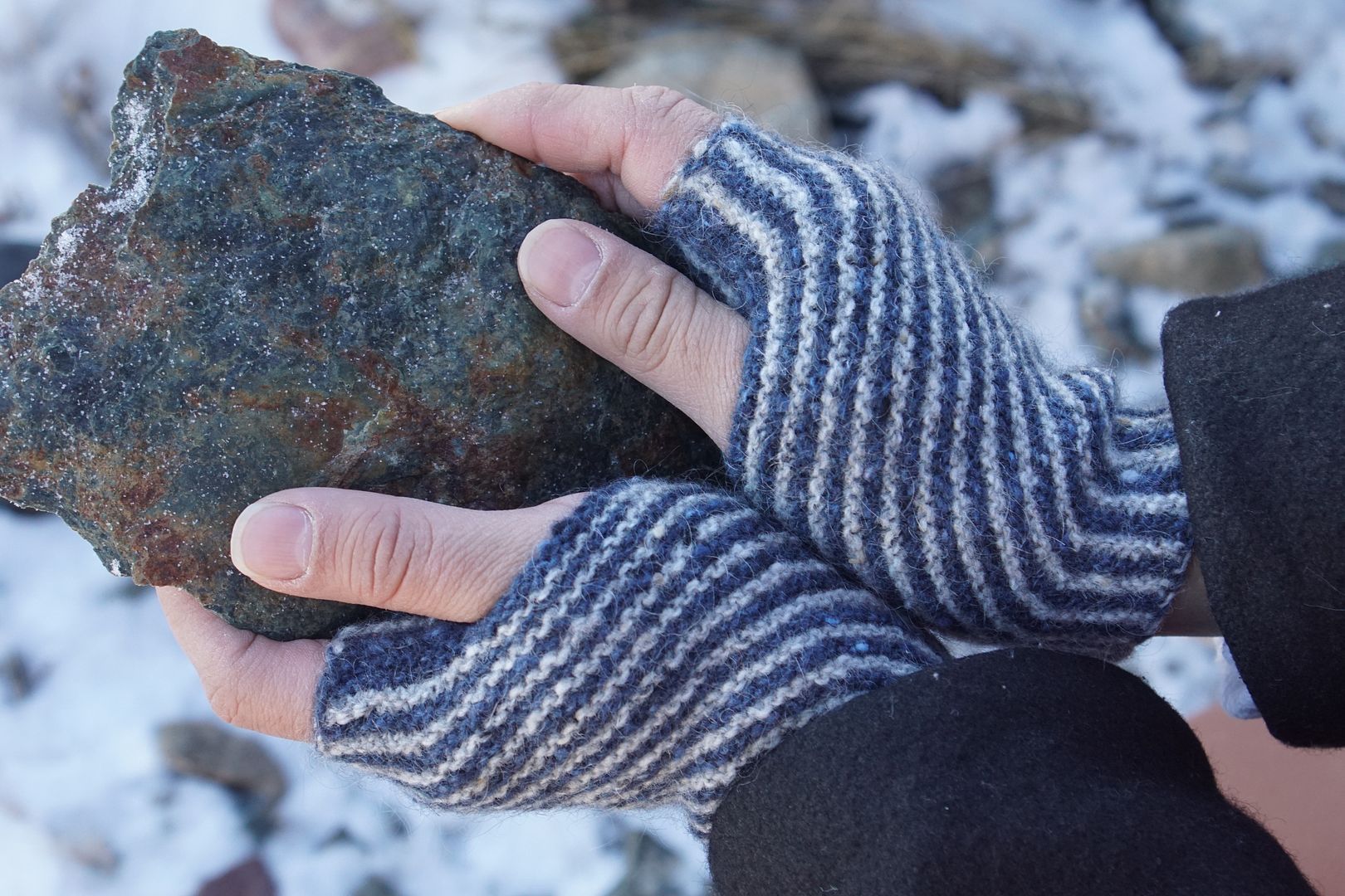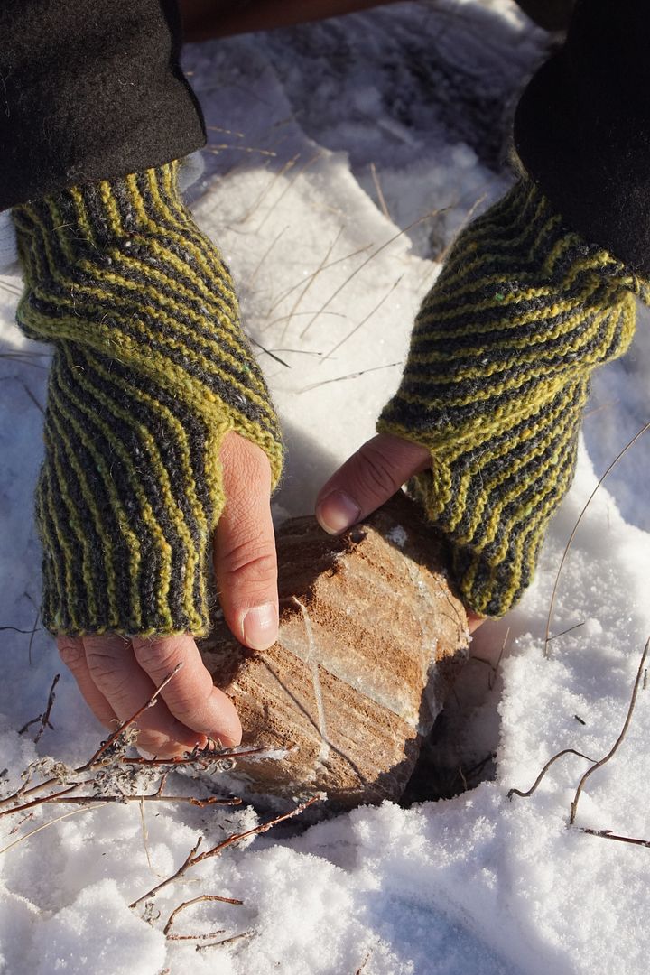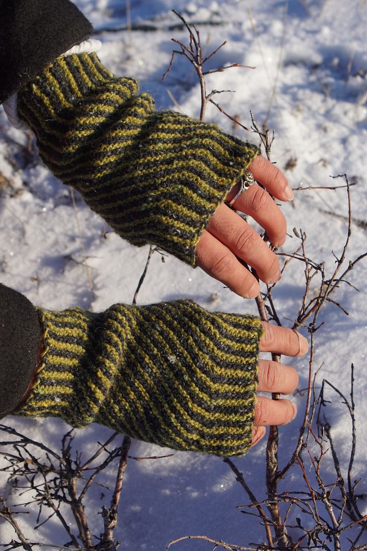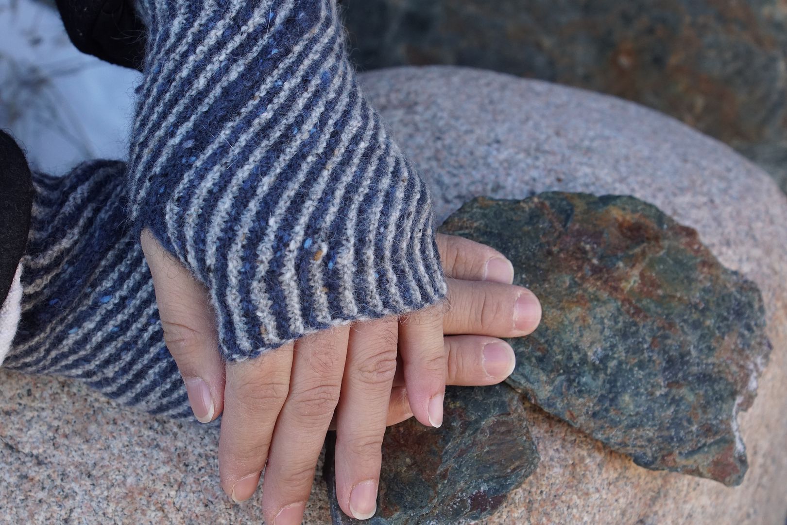 The mitts are knit sideways, and use simple increases and decreases to make diagonal stripes that look far more complex than they are. The fit is enhanced with some sneaky short rows.