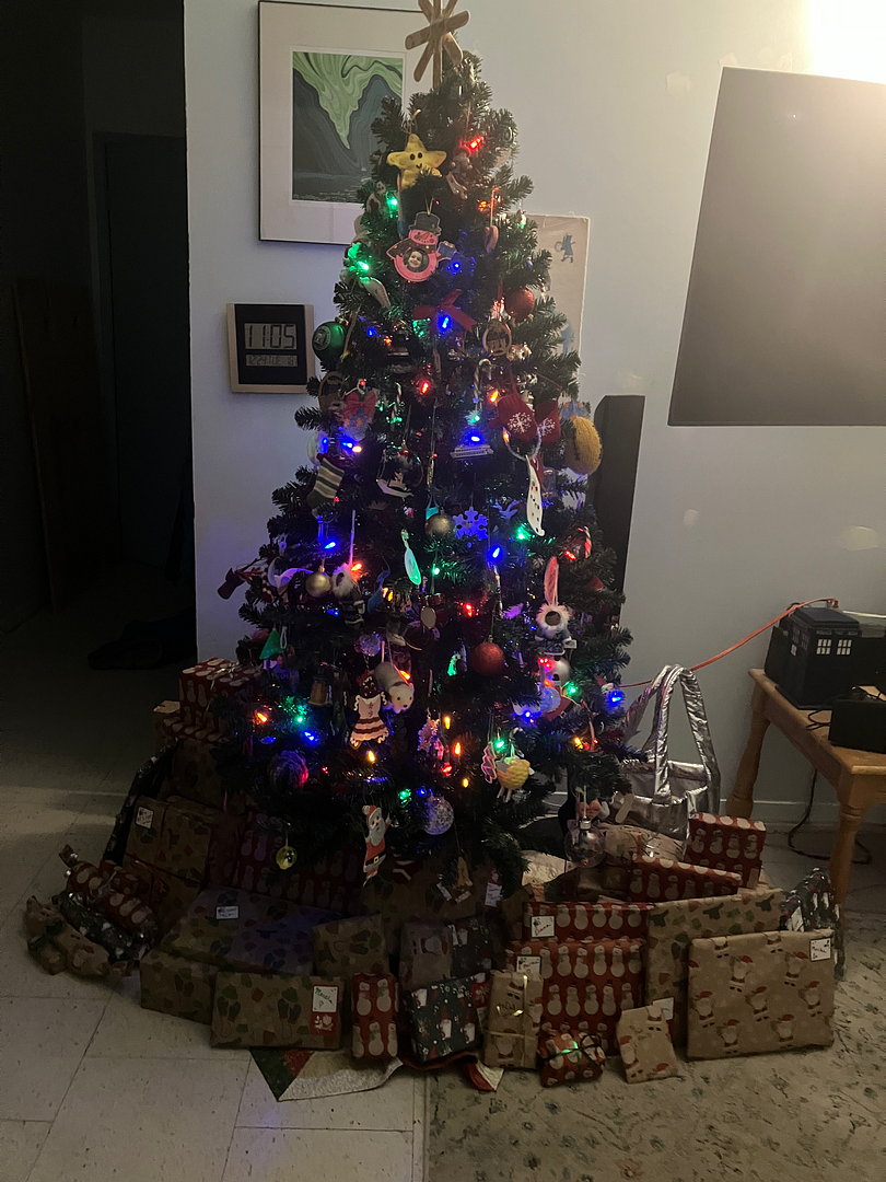 That night, the stockings were stuffed and the presents were laid round the tree with care.